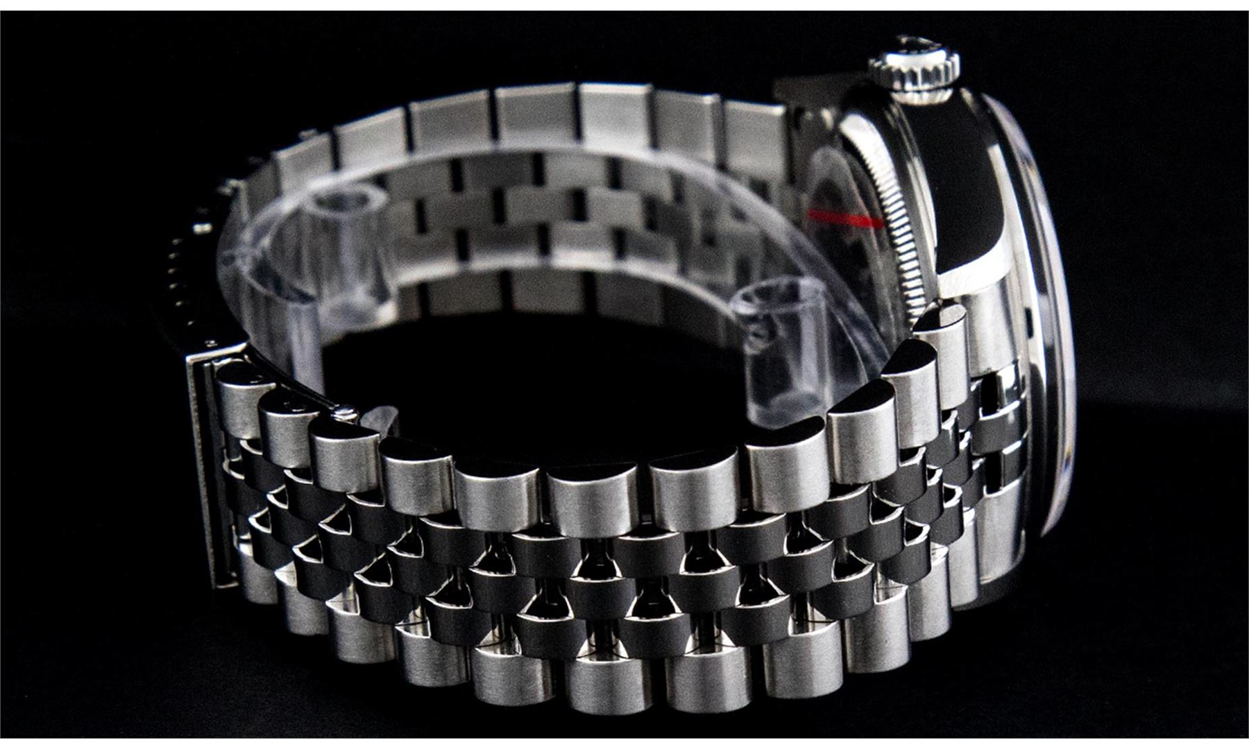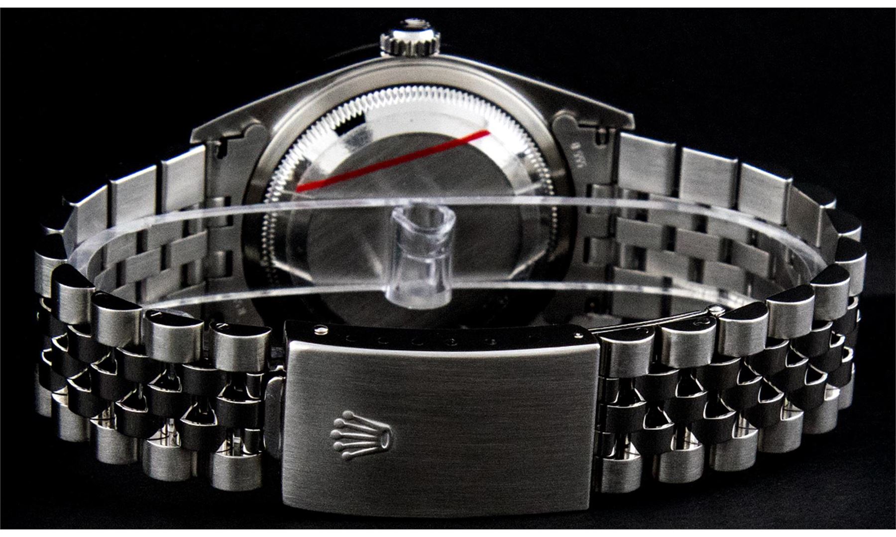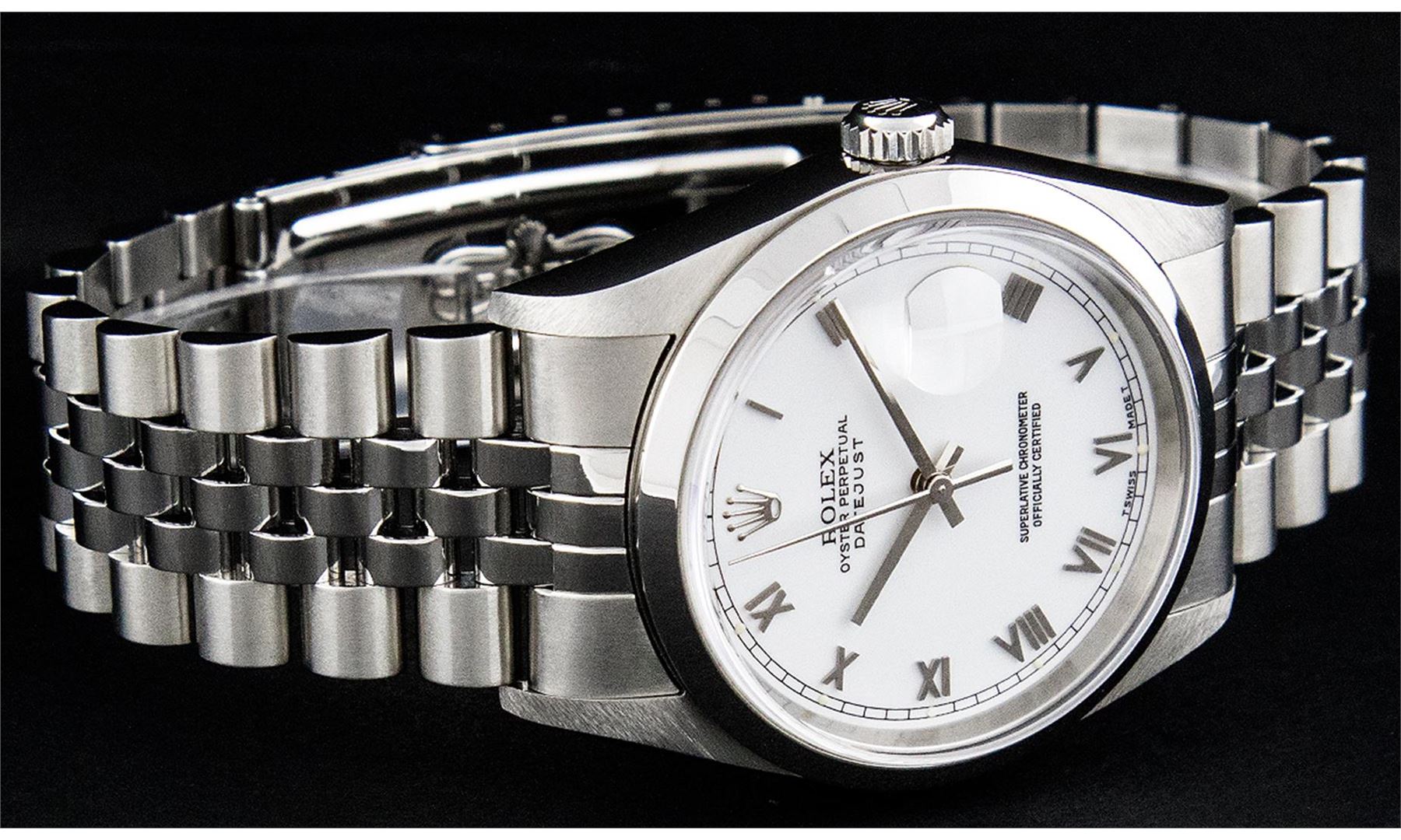 One Mens Rolex Datejust Polished Bright with Satin Finish, Serviced & Electronically Tested, Stainless Steel Case: 36mm, Stainless Steel Crown, Bezel: Stainless Steel Smooth Bezel. Crystal: Synthetic Sapphire Cyclops Lens. Movement: Automatic Winding Movement Caliber 3135. Dial: White Roman Dial. Date Window: 3 O'Clock Position Date Display, Quickset, Model: 16200. Condition: G-6 Extra Fine. Bracelet: Stainless Steel Jubilee. Bright Polish & Satin Finish. 7.0 Inch Length, Adjustable. Standard Clasp, With Rolex Logo. Comes with 6 month warranty.