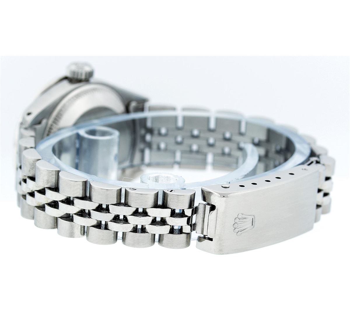 Ladies Rolex Datejust Polished Bright with Satin Finish, Serviced & Electronically Tested, Stainless Steel Case:26mm, Stainless Steel Crown, Custom Bezel: 18K White Gold Emerald Beadset Diamond Bezel, Diamond + Gem Count: 28 Diamonds + 4 Emerald. Total Weight .70 Carat, Clarity: SI-VS, Color: G to H. Custom Crystal: Synthetic Sapphire Cyclops Lens. Movement: Automatic Winding Movement Caliber 2030. Custom Dial: Refinished Yellow MOP With Diamond Hour Markers. Diamond Count: 10 Diamonds, Color: G To H, Clarity: SI-VS. Date Window: 3 O'Clock Position Date Display, Model: Datejust. Condition: G-6 Extra Fine. Bracelet: Stainless Steel Jubilee. Bright Polish & Satin Finish. 6.0 Inch Length, Adjustable. Standard Clasp, With Rolex Logo. Comes with 6 month warranty.