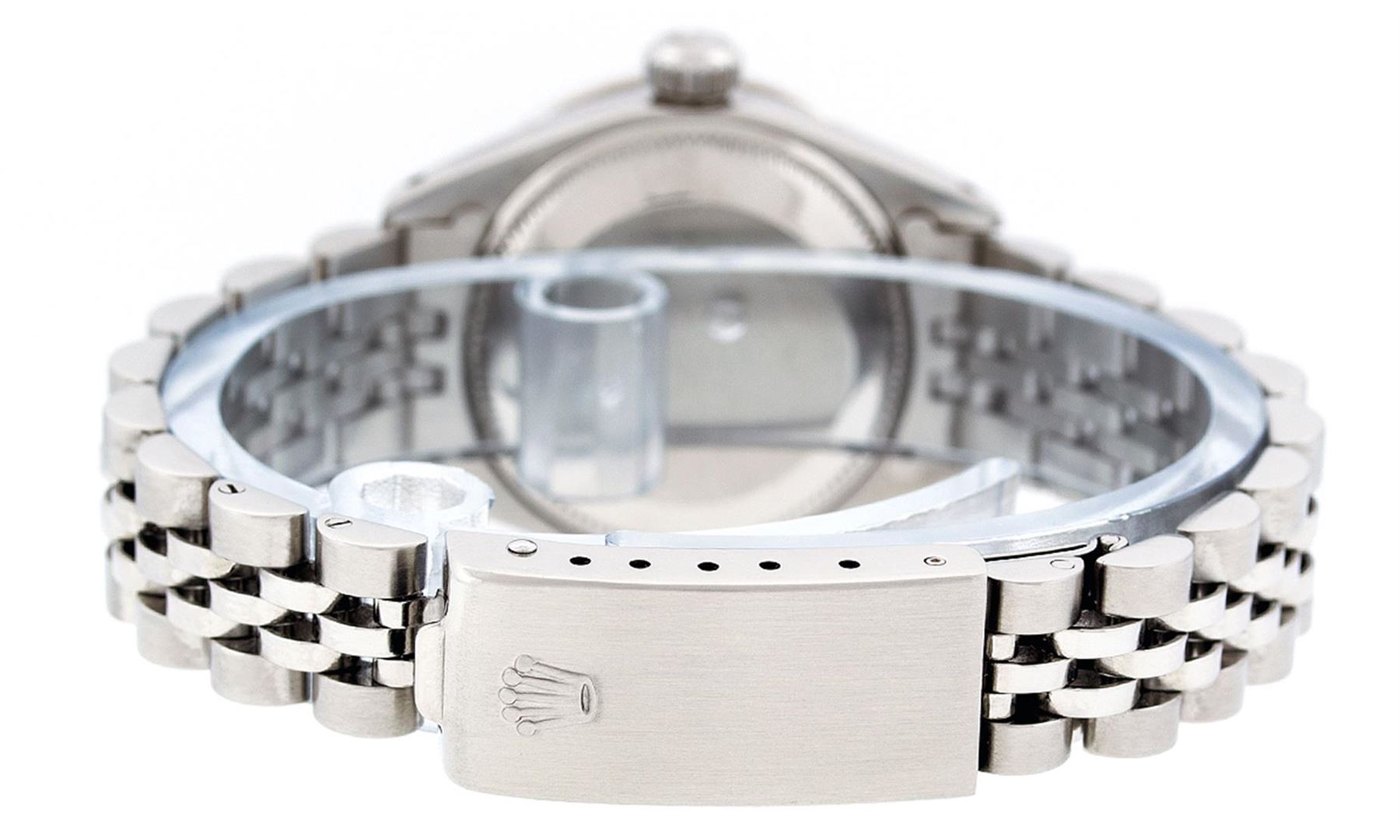 Ladies Rolex Datejust Polished Bright with Satin Finish, Serviced & Electronically Tested, Stainless Steel Case:26mm, Stainless Steel Crown, Custom Bezel: 18K White Gold Emerald Beadset Diamond Bezel, Diamond + Gem Count: 28 Diamonds + 4 Emerald. Total Weight .70 Carat, Clarity: SI-VS, Color: G to H. Custom Crystal: Synthetic Sapphire Cyclops Lens. Movement: Automatic Winding Movement Caliber 2030. Custom Dial: Refinished Yellow MOP With Diamond Hour Markers. Diamond Count: 10 Diamonds, Color: G To H, Clarity: SI-VS. Date Window: 3 O'Clock Position Date Display, Model: Datejust. Condition: G-6 Extra Fine. Bracelet: Stainless Steel Jubilee. Bright Polish & Satin Finish. 6.0 Inch Length, Adjustable. Standard Clasp, With Rolex Logo. Comes with 6 month warranty.