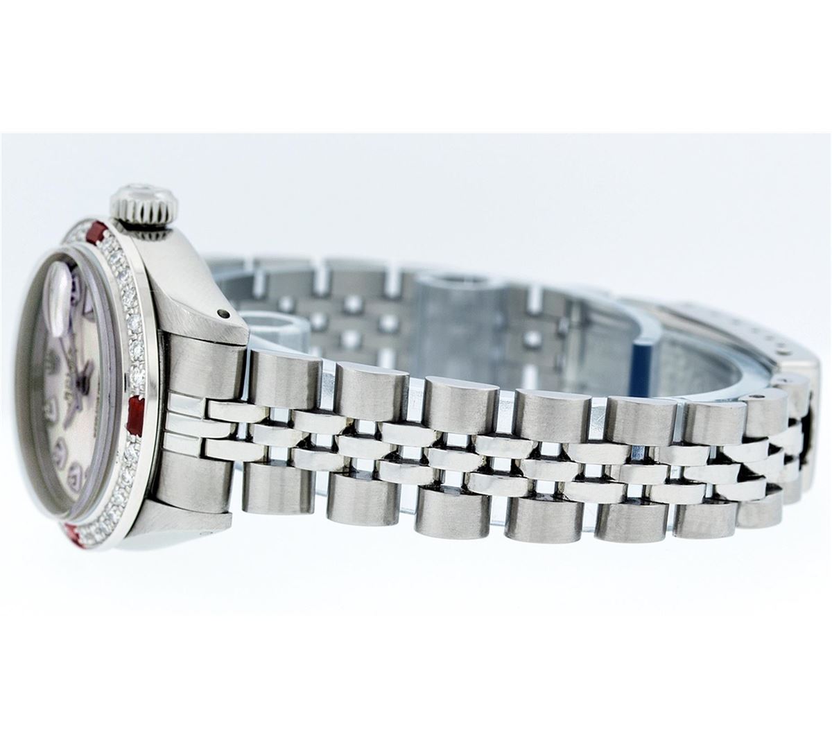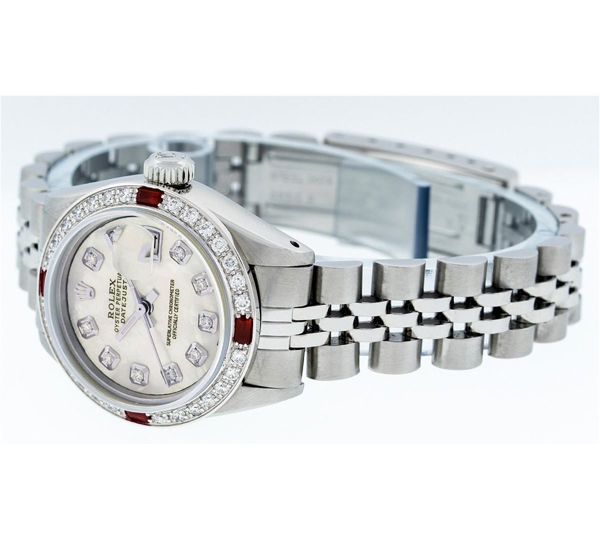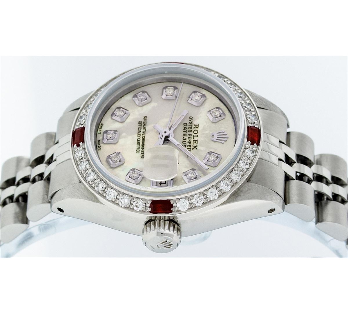 Ladies Rolex Datejust Polished Bright with Satin Finish, Serviced & Electronically Tested, Stainless Steel Case:26mm, Stainless Steel Crown, Custom Bezel: 18K White Gold Ruby Beadset Diamond Bezel, Diamond + Gem Count: 28 Diamonds + 4 Ruby. Total Weight .70 Carat, Clarity: SI-VS, Color: G to H. Custom Crystal: Synthetic Sapphire Cyclops Lens. Movement: Automatic Winding Movement Caliber 2030. Custom Dial: Refinished Yellow MOP With Diamond Hour Markers. Diamond Count: 10 Diamonds, Color: G To H, Clarity: SI-VS. Date Window: 3 O'Clock Position Date Display, Model: Datejust. Condition: G-6 Extra Fine. Bracelet: Stainless Steel Jubilee. Bright Polish & Satin Finish. 6.0 Inch Length, Adjustable. Standard Clasp, With Rolex Logo. Comes with 6 month warranty.