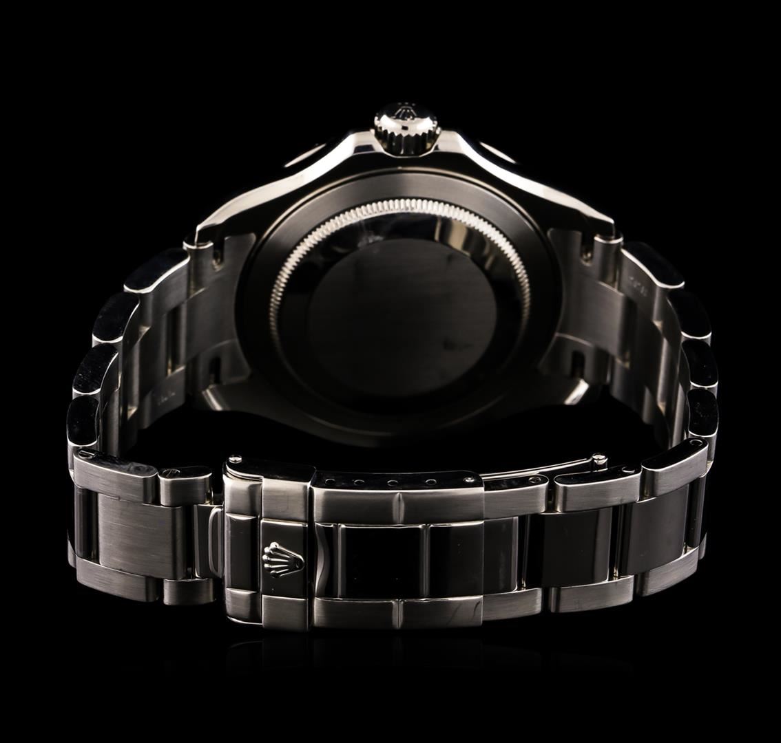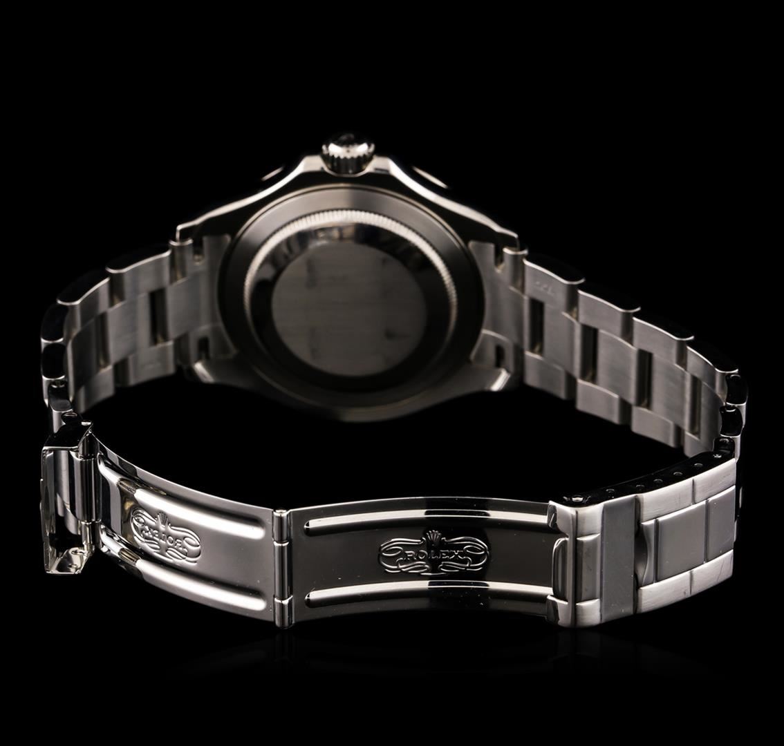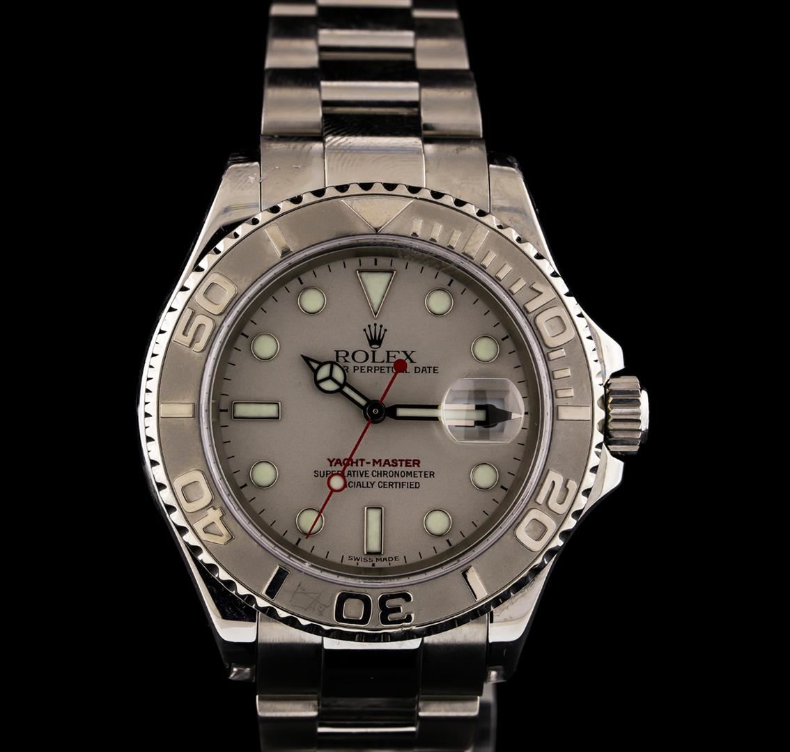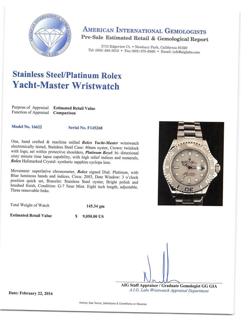 One, hand crafted & machine milled Rolex Yacht-Master wristwatch electronically tested, Stainless Steel Case: 40mm oyster, Crown: twinlock with logo, set within protective shoulders, Platinum Bezel: bi- directional sixty minute time lapse capability, with high relief indices and numerals, Rolex Hallmarked Crystal: synthetic sapphire cyclops lens. Movement: superlative chronometer, Rolex signed Dial: Platinum, with Blue luminous hands and indices, Circa: 2003, Date Window: 3 o'clock position quick set, Bracelet: Stainless Steel oyster, Bright polish and brushed finish, Condition: G-7 Near Mint. Eight inch length, adjustable. Three removable links. Total Weight of Watch 145.34gm. AIG Appraised at $9,050.00. AIG Appraised at $9,050.00.