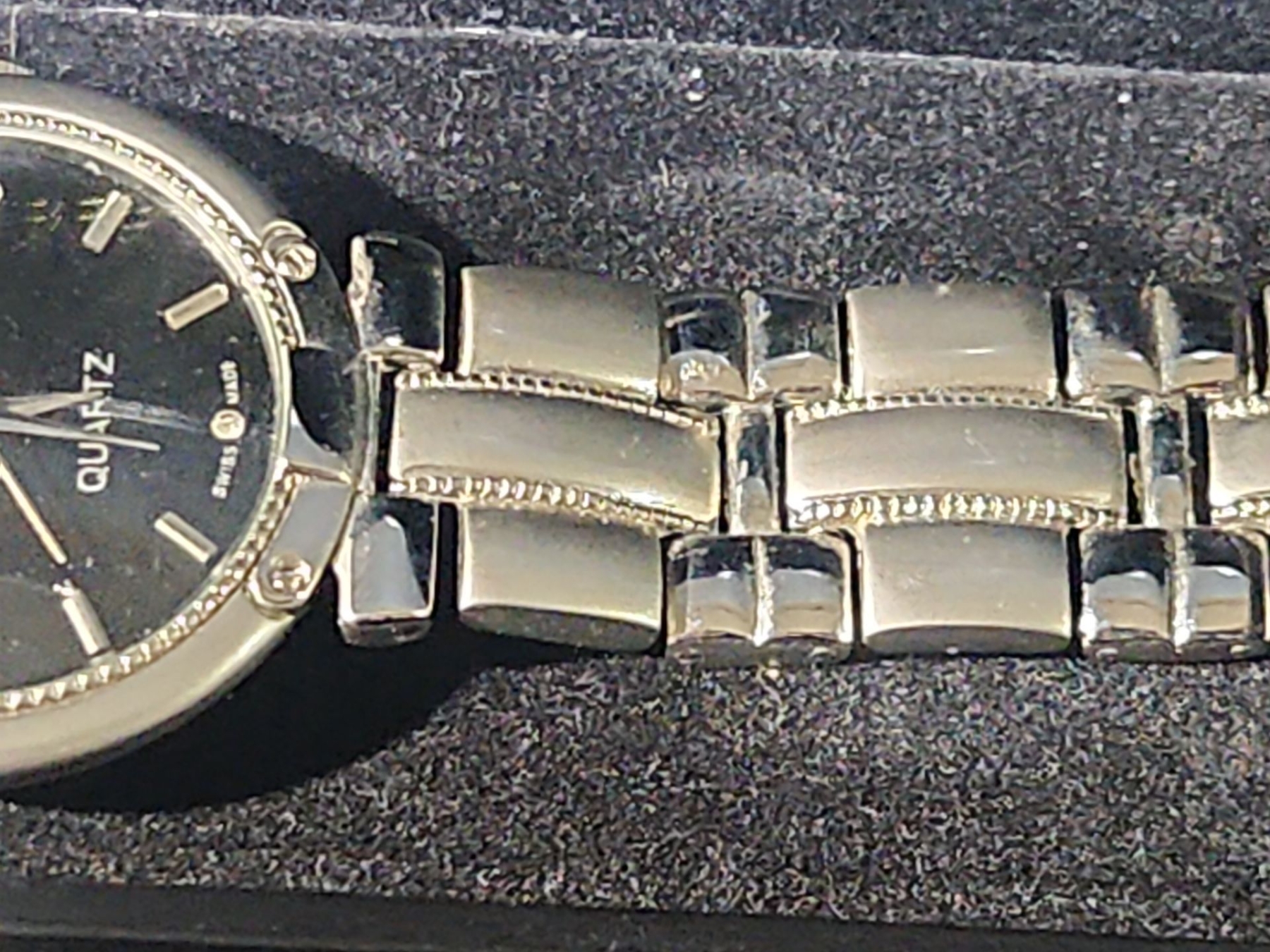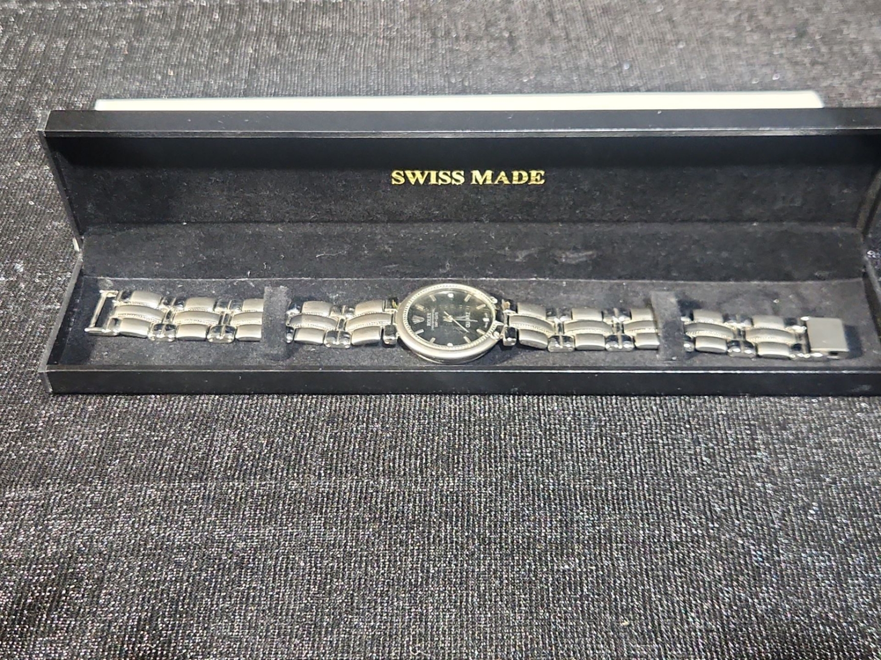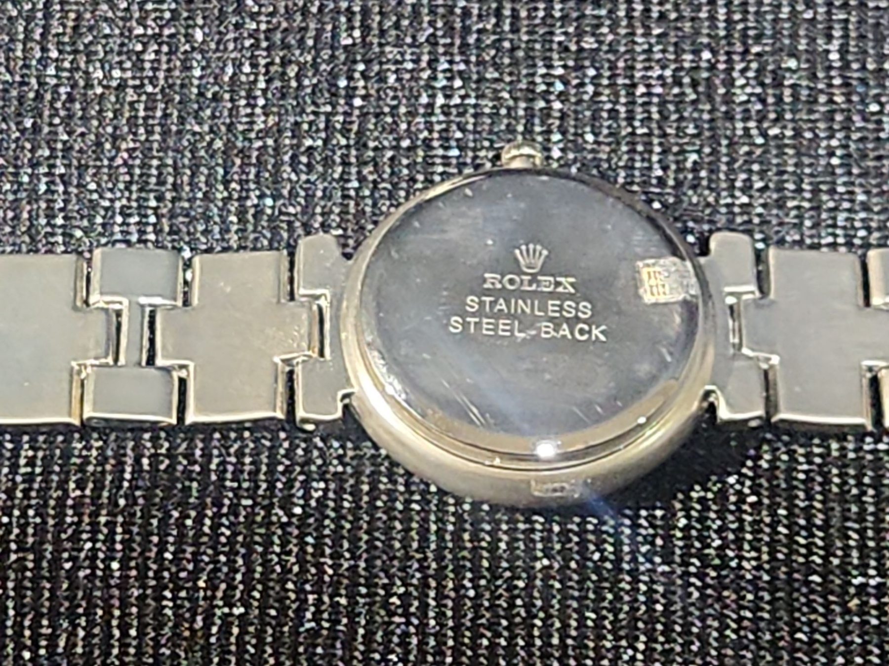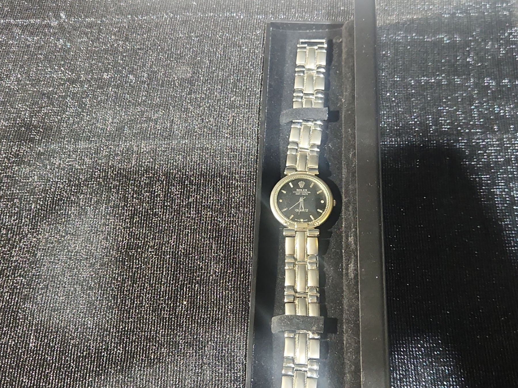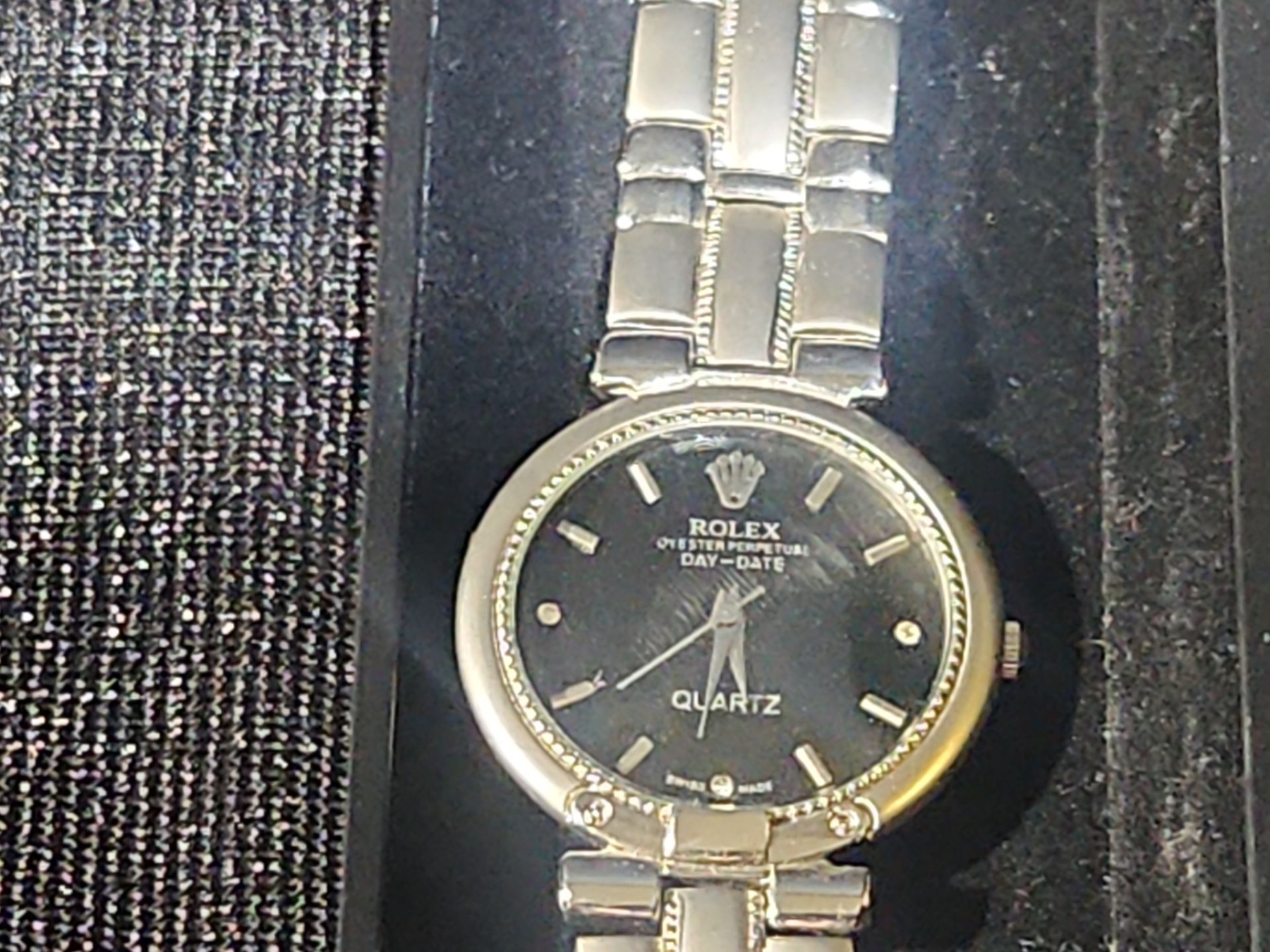 This Rolex is unverified for weather it is genuine or not. It mimics the appearance and style of the Rolex oysterquartz day-date watch, featuring a black face and dial and an integrated bracelet.