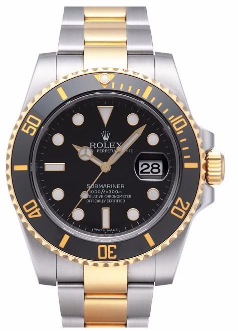 Model: 116613LN-0001 - CASE = [Material:Stainless Steel], [Case Diameter:40], [Case Thickness:12.8mm], [Bezel:Black Ceramic Rotatable], [Case Back:Solid], [Water Resistant:300 Meters - 1000 Feet], [Crystal:Scratch Resistant Sapphire],; DIAL = [Color:Date at 3, and Luminescent Hands and Hour Markers on Black],; MOVEMENT = [Type:Self Winding Rolex Chronometer Caliber 3135], [Crown:Fluted Gold Triplock with Rolex Logo],; BAND = [Clasp:Glidelock], [Type:Oyster], (Usually ships in 1 to 2 business days.)