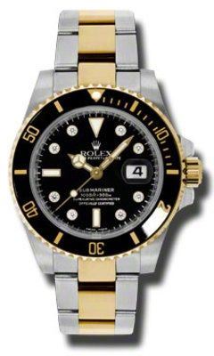 Model: 116613-BKD - CASE = [Material:Stainless Steel], [Case Diameter:40], [Case Thickness:12.8mm], [Bezel:Black Ceramic Rotatable], [Case Back:Solid], [Water Resistant:300 Meters - 1000 Feet], [Crystal:Scratch Resistant Sapphire], DIAL = [Color:Black with Date at 3 and Luminescent Hands and Diamond 8 Hour Markers], MOVEMENT = [Type:Self Winding Rolex Chronometer Caliber 3136], [Crown:Fluted Gold Triplock with Rolex Logo], BAND = [Clasp:Glidelock], [Type:Oyster], (Usually ships in 2 to 4 business days.)