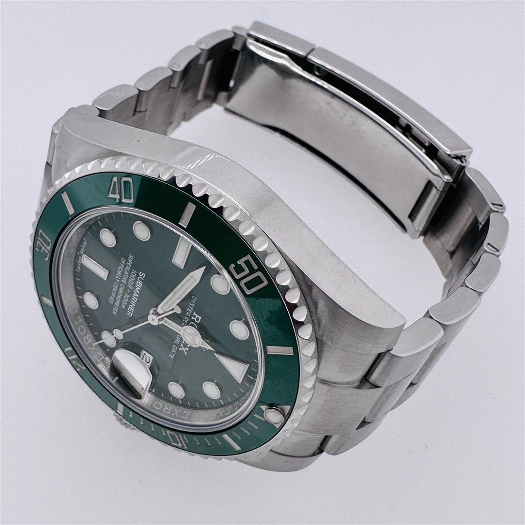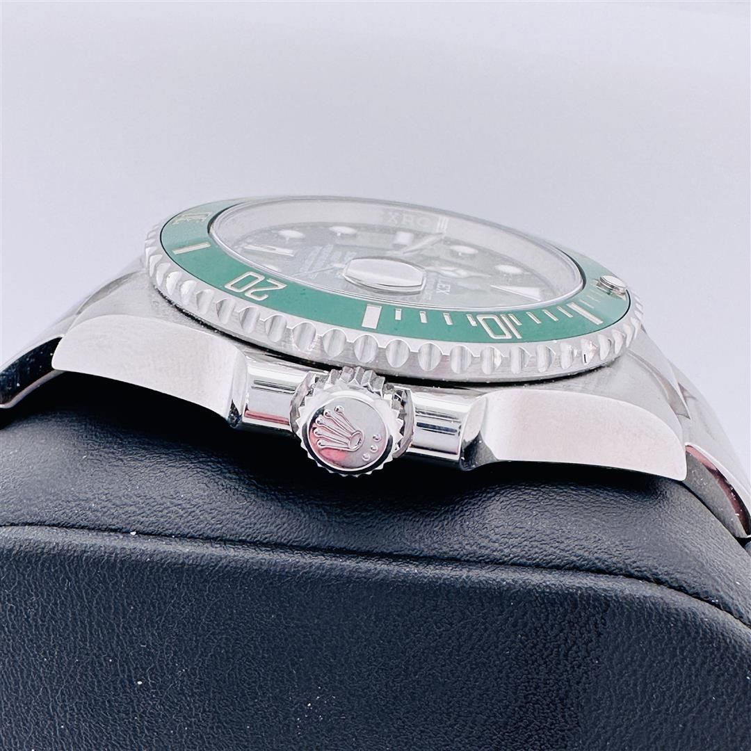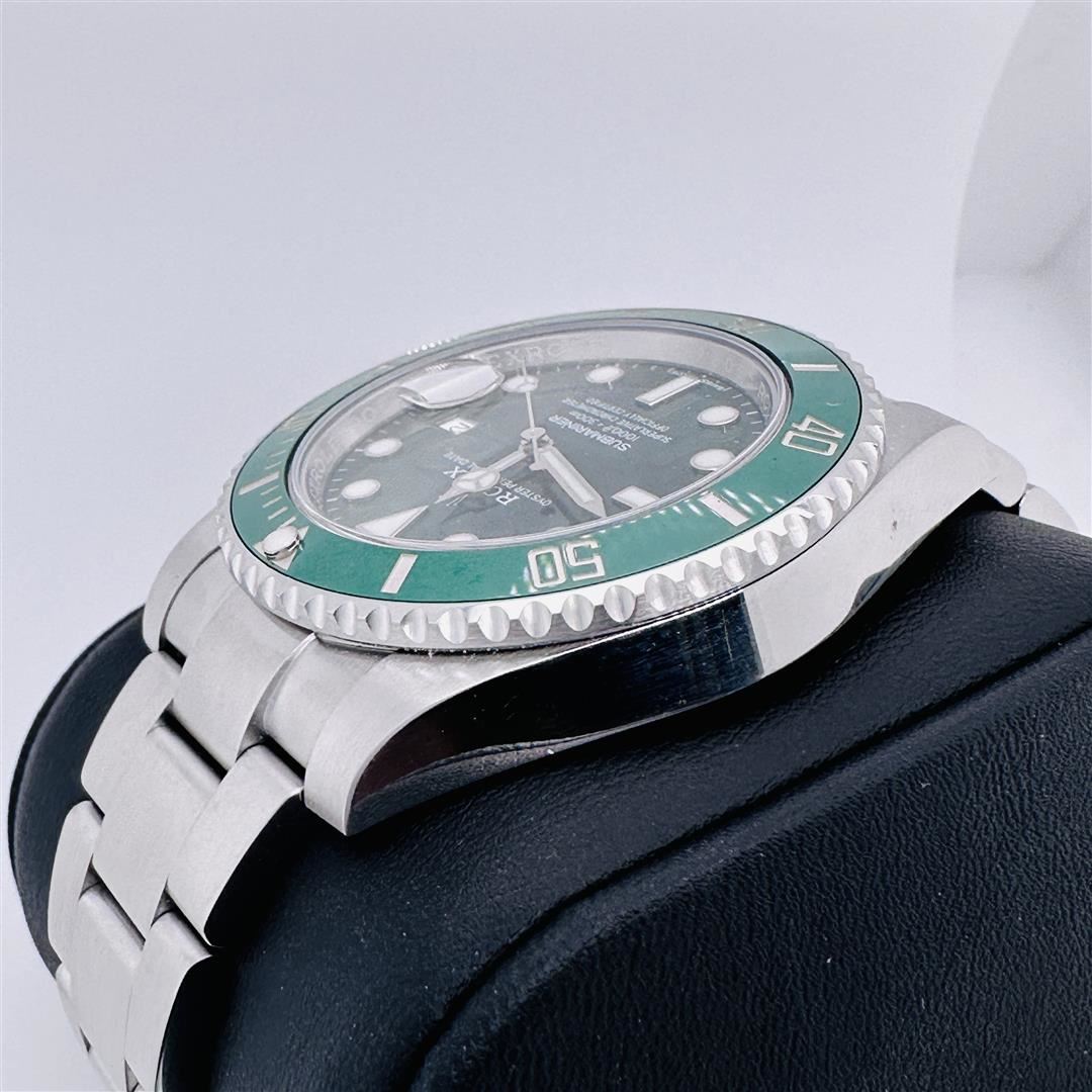 This Rolex timepiece is a highly coveted variant of the cherished anniversary Submariner, distinguished by the presence of Rolex's signature green hue on both the bezel and dial. This exceptional diver's watch is a coveted item for collectors and can be proudly owned in its exceptional Rolex condition, complete with its original box and papers. Affectionately referred to as the "Hulk," this iconic green Submariner boasts a modernized case design that includes a larger crown guard and thicker lugs, even though it maintains the classic 40mm diameter found in its predecessors. This update results in a slightly more substantial wrist presence when worn. Furthermore, this edition of the Submariner showcases a contemporary bracelet with polished center links and enhanced structural integrity. In its entirety, the "Hulk" lives up to its impressive moniker, commanding attention with its commanding wrist presence and the enchanting green bezel and dial that have become its defining features.