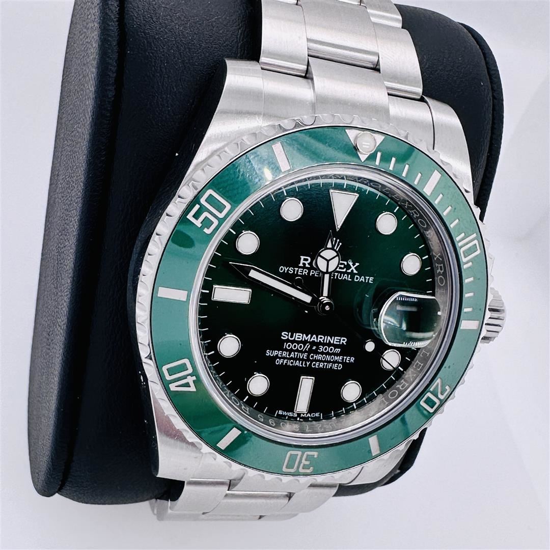 This Rolex timepiece is a highly coveted variant of the cherished anniversary Submariner, distinguished by the presence of Rolex's signature green hue on both the bezel and dial. This exceptional diver's watch is a coveted item for collectors and can be proudly owned in its exceptional Rolex condition, complete with its original box and papers. Affectionately referred to as the "Hulk," this iconic green Submariner boasts a modernized case design that includes a larger crown guard and thicker lugs, even though it maintains the classic 40mm diameter found in its predecessors. This update results in a slightly more substantial wrist presence when worn. Furthermore, this edition of the Submariner showcases a contemporary bracelet with polished center links and enhanced structural integrity. In its entirety, the "Hulk" lives up to its impressive moniker, commanding attention with its commanding wrist presence and the enchanting green bezel and dial that have become its defining features.