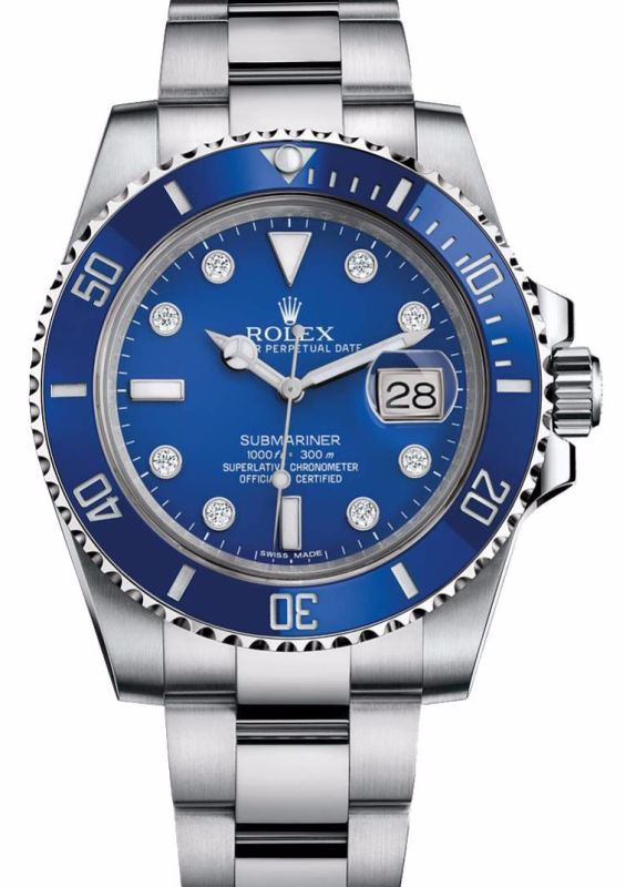 Model: 116619-BLD - CASE = [Material:18K White Gold], [Case Diameter:40], [Case Thickness:12.8mm], [Bezel:Black Ceramic Rotatable], [Case Back:Solid], [Water Resistant:300 Meters - 1000 Feet], [Crystal:Scratch Resistant Sapphire],; DIAL = [Color:Blue with Date at 3 and Luminescent Hands and 8 Diamond Hour Markers],; MOVEMENT = [Type:Self Winding Rolex Chronometer Caliber 3140], [Crown:Fluted Stainless Steel Triplock with Rolex Logo],; BAND = [Clasp:Glidelock], [Type:Oyster], (Usually ships in 2 to 4 business days.)