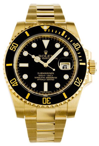 Model: 116618-BKD - CASE = [Material:18K Yellow Gold], [Case Diameter:40], [Case Thickness:12.8mm], [Bezel:Black Ceramic Rotatable], [Case Back:Solid], [Water Resistant:300 Meters - 1000 Feet], [Crystal:Scratch Resistant Sapphire], DIAL = [Color:Date at 3, Luminescent Hands and 8 Diamond Hour Markers on Black], MOVEMENT = [Type:Self Winding Rolex Chronometer Caliber 3136], [Crown:Fluted Gold Triplock with Rolex Logo], BAND = [Clasp:Glidelock], [Type:18K Polished Yellow Gold], (Usually ships in 2 to 4 business days.)