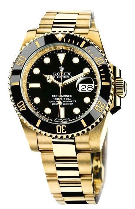Model: 116618LN-0001 - CASE = [Material:18K Yellow Gold], [Case Diameter:40], [Case Thickness:12.8mm], [Bezel:Black Ceramic Rotatable], [Case Back:Solid], [Water Resistant:300 Meters - 1000 Feet], [Crystal:Scratch Resistant Sapphire], DIAL = [Color:Date at 3, Luminescent Hands on Black], MOVEMENT = [Type:Self Winding Rolex Chronometer Caliber 3135], [Crown:Fluted Gold Triplock with Rolex Logo], BAND = [Clasp:Glidelock], [Type:18K Polished Yellow Gold], (Usually ships in 2 to 4 business days.)