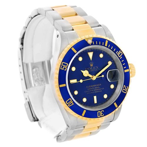 One Rolex Submariner Steel Blue Dial 18K Yellow Gold Mens Watch. The watch is in excellent condition and the details are as follows: Model: 16613, Movement: Officially certified chronometer self-winding movement. Jewels: 31, Caliber: 3135. Case: Stainless steel and 18k yellow gold case 40.0 mm in diameter. Crown: Rolex logo on a crown. Bezel: Blue insert special time-lapse unidirectional rotating bezel. Crystal: Scratch resistant sapphire crystal with Cyclops magnifier. Dial: Blue dial with luminous inlay hands and hour markers. Date calendar window at 3 o'clock aperture. Bracelet: Stainless steel and 18k yellow gold oyster bracelet with flip-lock clasp.