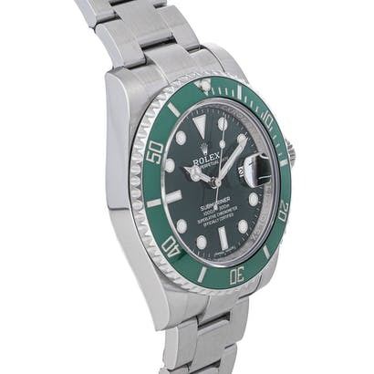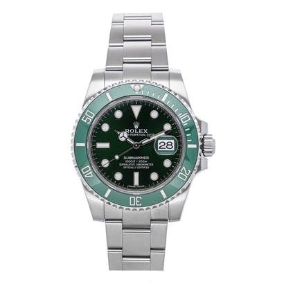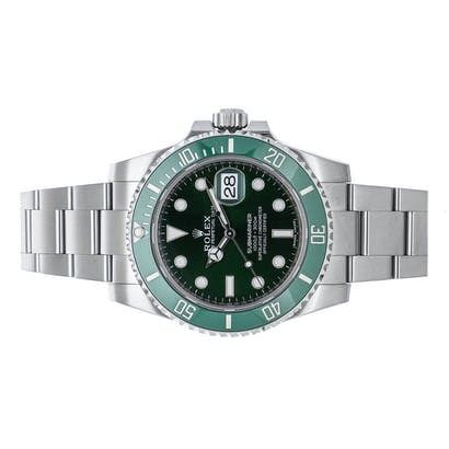 Pre-Owned Rolex Submariner Date "Hulk" (116610LV) self-winding automatic watch, features a 40mm stainless steel case with a green Cerachrom bezel surrounding a green dial on a stainless steel Oyster bracelet with folding buckle.