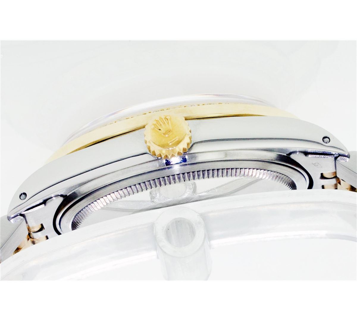 One Mens Two Tone Rolex Datejust Polished, Serviced & Electronically Tested, 14K Yellow Gold & Stainless Steel Case:36mm, 14K Yellow Gold Crown, Custom Bezel: 18K Yellow Gold Beadset Diamond Bezel, Diamond Count: 44 Diamonds Total Weight 1.00 Carat, Clarity: Si-VS, Color: G to H. Custom Crystal: Synthetic Sapphire Cyclops Lens. Movement: Automatic Winding Movement Caliber 3035. Custom Dial: Salmon Dial With Diamond Hour Markers. Diamond Count: 10 Diamonds, Color: G to H, Clarity: SI-VS Date Window: 3 O'Clock Position Date Display, Quickset, Model: 16013 Condition: Excellent, G-6 Extra Fine. Bracelet: Two Tone 14K Yellow Gold & Stainless Steel Jubilee. Bright Polish. 6.5 Inch Length, Adjustable. Standard Clasp, With Rolex Logo.