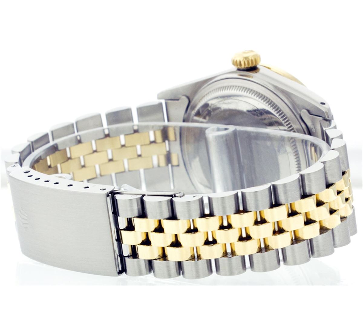 One Mens Two Tone Rolex Datejust Polished, Serviced & Electronically Tested, 14K Yellow Gold & Stainless Steel Case:36mm, 14K Yellow Gold Crown, Custom Bezel: 18K Yellow Gold Beadset Diamond Bezel, Diamond Count: 44 Diamonds Total Weight 1.00 Carat, Clarity: Si-VS, Color: G to H. Custom Crystal: Synthetic Sapphire Cyclops Lens. Movement: Automatic Winding Movement Caliber 3035. Custom Dial: Mother Of Pearl With Roman Hour Markers. Date Window: 3 O'Clock Position Date Display, Quickset, Model: 16013 Condition: G-6 Extra Fine. Bracelet: Two Tone 14K Yellow Gold & Stainless Steel Jubilee. Bright Polish. 6.5 Inch Length, Adjustable. Standard Clasp, With Rolex Logo.
