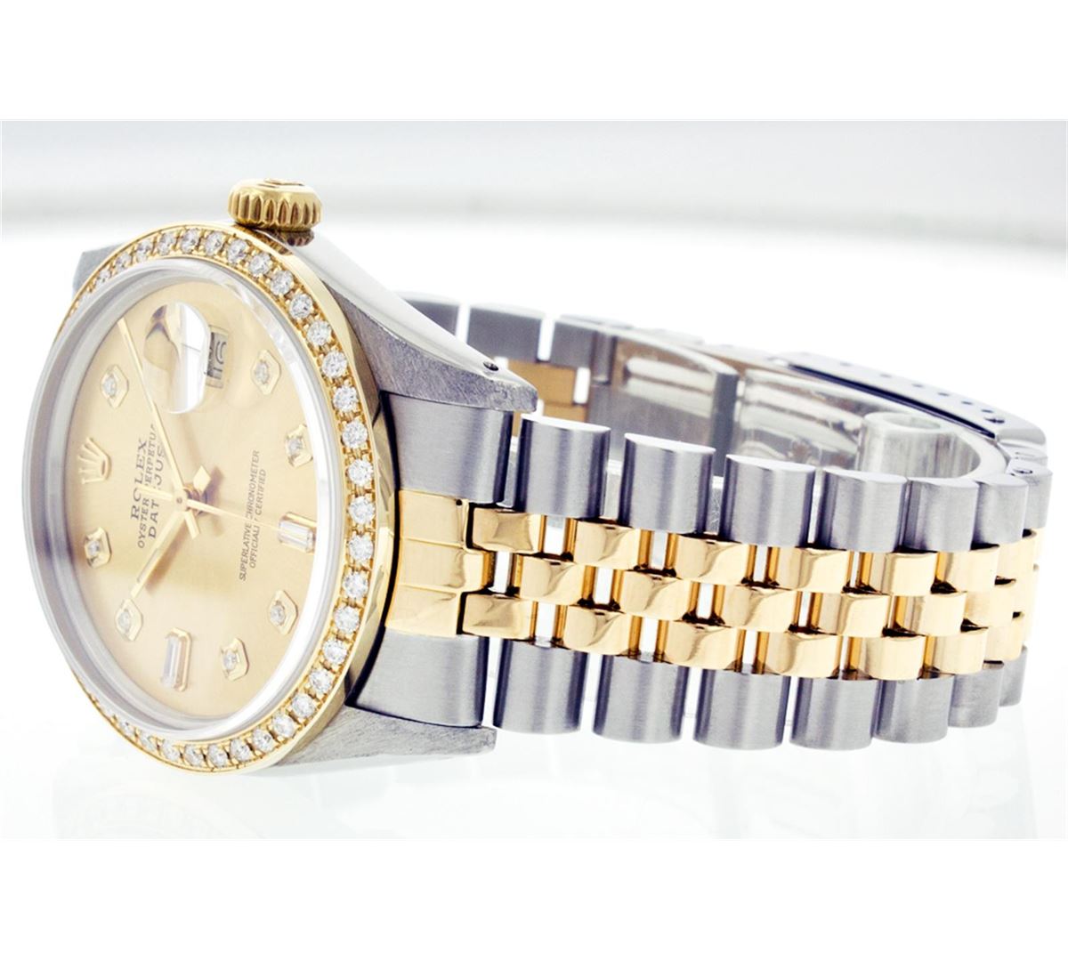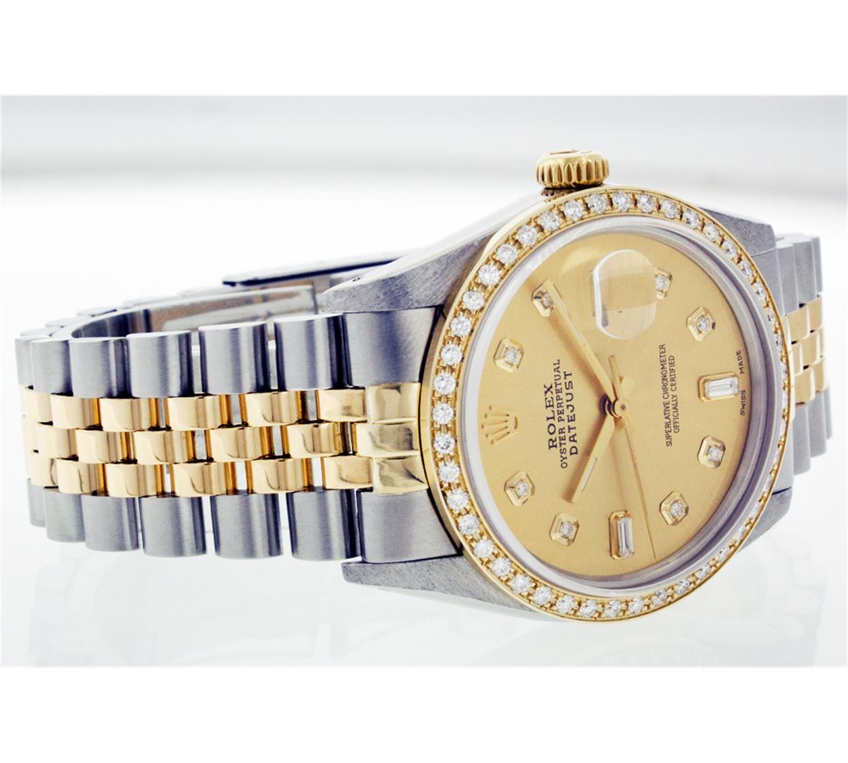 One Mens Two Tone Rolex Datejust Polished, Serviced & Electronically Tested, 14K Yellow Gold & Stainless Steel Case:36mm, 14K Yellow Gold Crown, Custom Bezel: 18K Yellow Gold Beadset Diamond Bezel, Diamond Count: 44 Diamonds Total Weight 1.00 Carat, Clarity: Si-VS, Color: G to H. Custom Crystal: Synthetic Sapphire Cyclops Lens. Movement: Automatic Winding Movement Caliber 3035. Custom Dial: Champagne Dial Set With Diamond Hour Markers and Baguette Diamonds On The Six And Nine Hour Marker, 8 Diamonds + 2 Baguettes in Dial G To H In Color, Si-VS Clarity. Date Window: 3 O'Clock Position Date Display, Quickset, Model: 16013 Condition: G-6 Extra Fine. Bracelet: Two Tone 14K Yellow Gold & Stainless Steel Jubilee. Bright Polish. 6.5 Inch Length, Adjustable. Standard Clasp, With Rolex Logo.