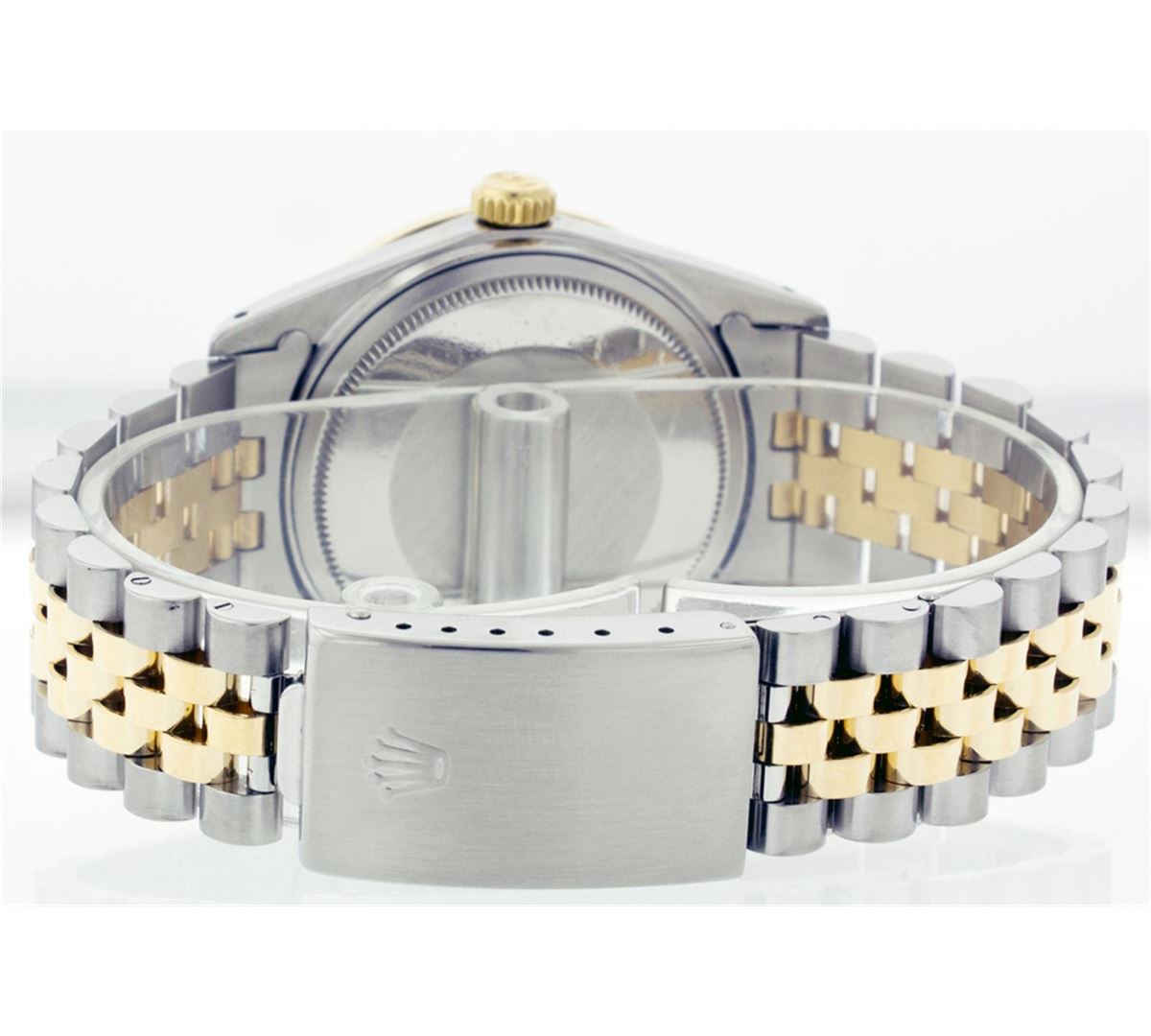 One Mens Two Tone Rolex Datejust Polished, Serviced & Electronically Tested, 14K Yellow Gold & Stainless Steel Case:36mm, 14K Yellow Gold Crown, Custom Bezel: 18K Yellow Gold Beadset Diamond Bezel, Diamond Count: 44 Diamonds Total Weight 1.00 Carat, Clarity: Si-VS, Color: G to H. Custom Crystal: Synthetic Sapphire Cyclops Lens. Movement: Automatic Winding Movement Caliber 3035. Custom Dial: Salmon Dial With Diamond Hour Markers. Diamond Count: 10 Diamonds, Color: G to H, Clarity: SI-VS Date Window: 3 O'Clock Position Date Display, Quickset, Model: 16013 Condition: Excellent, G-6 Extra Fine. Bracelet:Two Tone 14K Yellow Gold & Stainless Steel Jubilee. Bright Polish. 6.5 Inch Length, Adjustable. Standard Clasp, With Rolex Logo.