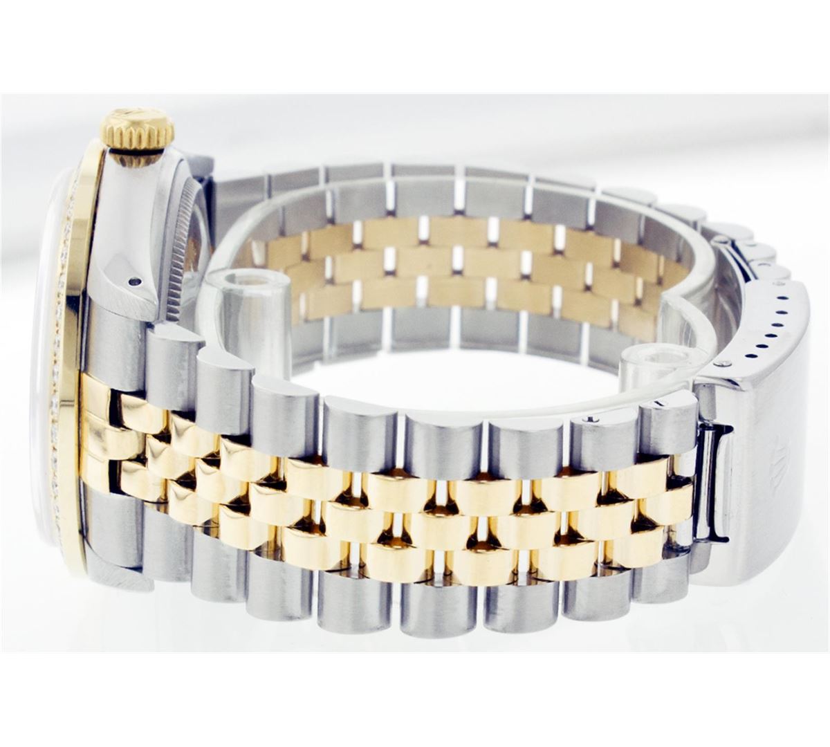 One Mens Two Tone Rolex Datejust Polished, Serviced & Electronically Tested, 14K Yellow Gold & Stainless Steel Case:36mm, 14K Yellow Gold Crown, Custom Bezel: 18K Yellow Gold Beadset Diamond Bezel, Diamond Count: 44 Diamonds Total Weight 1.00 Carat, Clarity: Si-VS, Color: G to H. Custom Crystal: Synthetic Sapphire Cyclops Lens. Movement: Automatic Winding Movement Caliber 3035. Custom Dial: Salmon Dial With Diamond Hour Markers. Diamond Count: 10 Diamonds, Color: G to H, Clarity: SI-VS Date Window: 3 O'Clock Position Date Display, Quickset, Model: 16013 Condition: Excellent, G-6 Extra Fine. Bracelet: Two Tone 14K Yellow Gold & Stainless Steel Jubilee. Bright Polish. 6.5 Inch Length, Adjustable. Standard Clasp, With Rolex Logo.