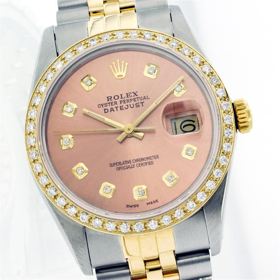 One Mens Two Tone Rolex Datejust Polished, Serviced & Electronically Tested, 14K Yellow Gold & Stainless Steel Case:36mm, 14K Yellow Gold Crown, Custom Bezel: 18K Yellow Gold Beadset Diamond Bezel, Diamond Count: 44 Diamonds Total Weight 1.00 Carat, Clarity: Si-VS, Color: G to H. Custom Crystal: Synthetic Sapphire Cyclops Lens. Movement: Automatic Winding Movement Caliber 3035. Custom Dial: Salmon Dial With Diamond Hour Markers. Diamond Count: 10 Diamonds, Color: G to H, Clarity: SI-VS Date Window: 3 O'Clock Position Date Display, Quickset, Model: 16013 Condition: Excellent, G-6 Extra Fine. Bracelet:Two Tone 14K Yellow Gold & Stainless Steel Jubilee. Bright Polish. 6.5 Inch Length, Adjustable. Standard Clasp, With Rolex Logo.