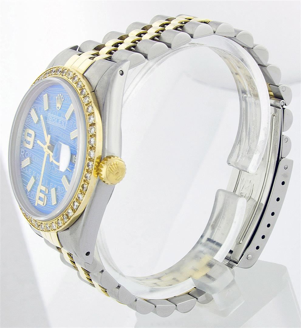 One Gents Two Tone Rolex Datejust Polished, Serviced & Electronically Tested, 14K Yellow Gold & Stainless Steel Case:36mm, 14K Yellow Gold Crown, Custom Bezel: 18K Yellow Gold Beadset Diamond Bezel, Diamond Count: 44 Diamonds Total Weight 1.0 Carat, Clarity: Si-VS, Color: G to H. Custom Crystal: Synthetic Sapphire Cyclops Lens. Movement: Automatic Winding Movement Caliber 3035. Custom Dial: Blue Wave Dial With Index Hour Markers. Date Window: 3 O'Clock Position Date Display, Quickset, Model: 16013 Condition: G-6 Extra Fine. Bracelet: Two Tone 14K Yellow Gold & Stainless Steel Jubilee. Bright Polish. 6.5 Inch Length, Adjustable. Standard Clasp, With Rolex Logo.