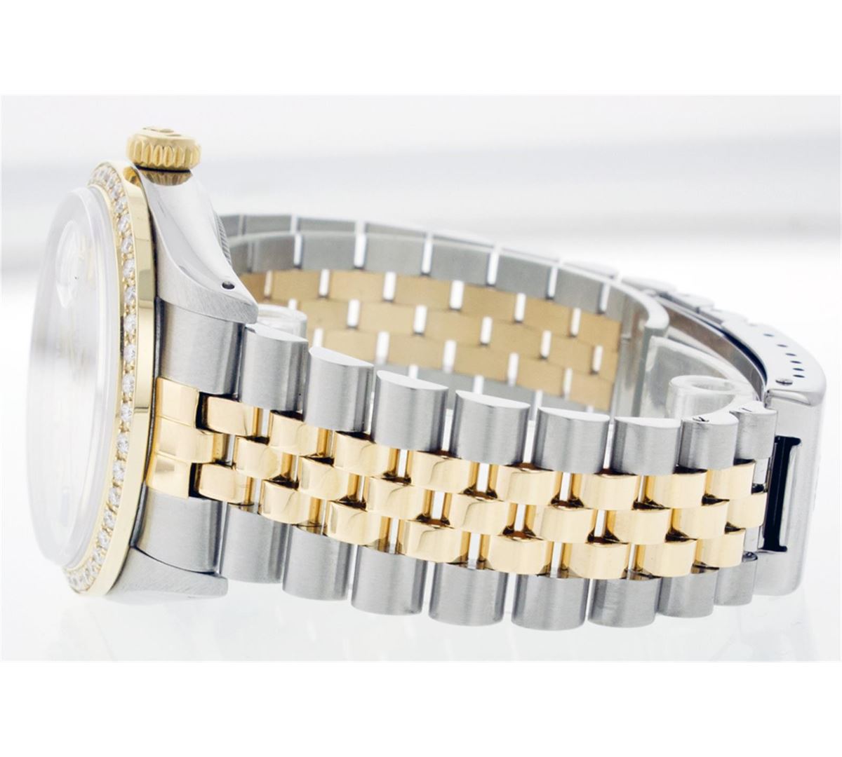 One Mens Two Tone Rolex Datejust Polished, Serviced & Electronically Tested, 14K Yellow Gold & Stainless Steel Case:36mm, 14K Yellow Gold Crown, Custom Bezel: 18K Yellow Gold Beadset Diamond Bezel, Diamond Count: 44 Diamonds Total Weight 1.00 Carat, Clarity: Si-VS, Color: G to H. Custom Crystal: Synthetic Sapphire Cyclops Lens. Movement: Automatic Winding Movement Caliber 3035. Custom Dial: Mother Of Pearl Dial Set With Diamond Hour Markers, 8 Diamonds + 2 Sapphire Baguettes in Dial G To H In Color , Date Window: 3 O'Clock Position Date Display, Quickset, Model: 16013 Condition: G-6 Extra Fine. Bracelet: Two Tone 14K Yellow Gold & Stainless Steel Jubilee. Bright Polish. 6.5 Inch Length, Adjustable. Standard Clasp, With Rolex Logo.