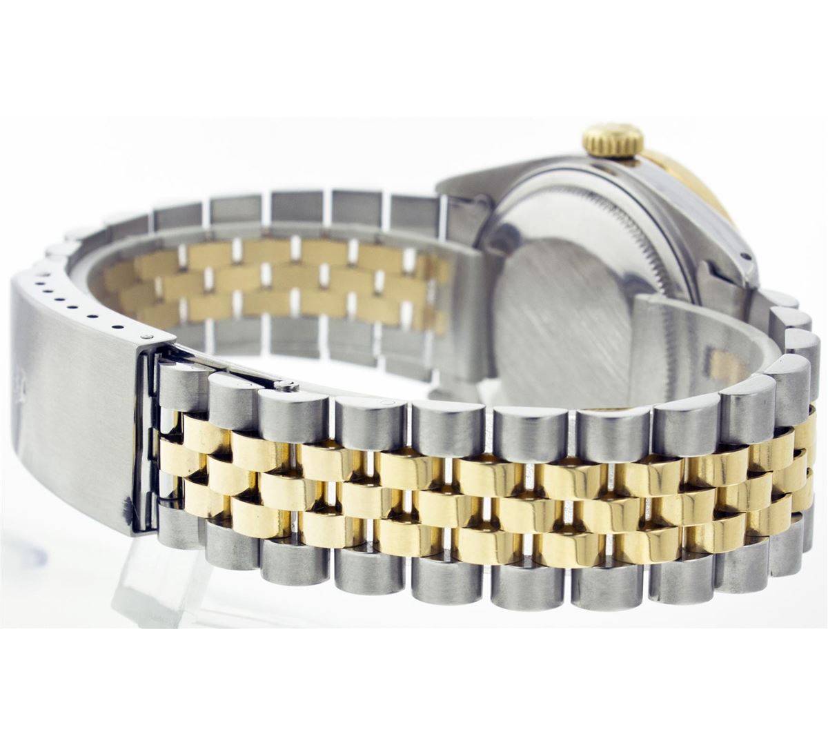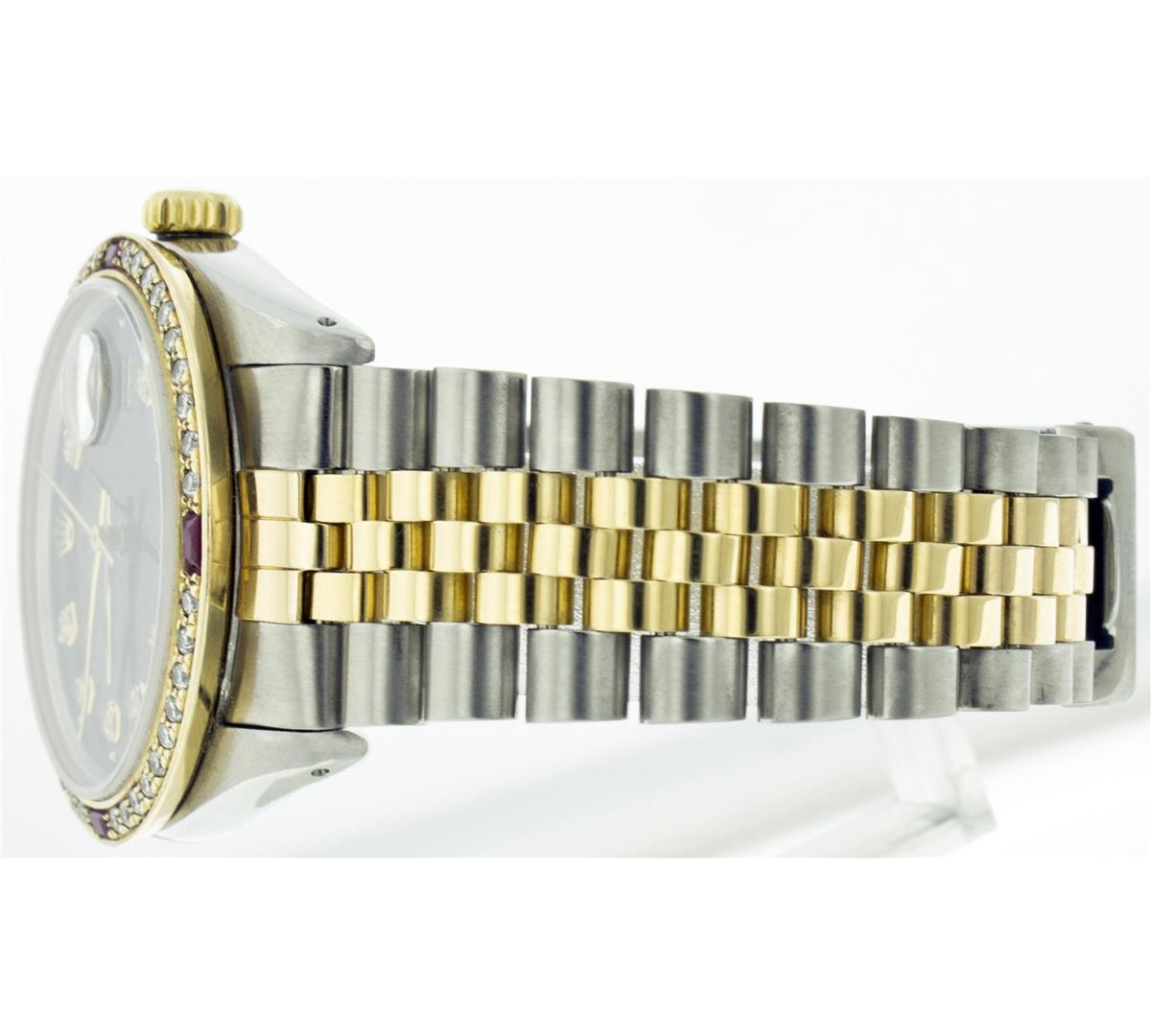 One Gents Two Tone Rolex Datejust Polished, Serviced & Electronically Tested, 14K Yellow Gold & Stainless Steel Case:36mm, 14K Yellow Gold Crown, Custom Bezel: 18K Yellow Gold Ruby Beadset Diamond Bezel, Diamond Count: 36 Diamonds + 4 Ruby Total Weight 1.0 Carat, Clarity: Si-VS, Color: G to H. Custom Crystal: Synthetic Sapphire Cyclops Lens. Movement: Automatic Winding Movement Caliber 3035. Custom Dial: Black Diamond Dial, Diamond Count: 10 Diamonds, Color: G to H, Clarity: SI-VS Date Window: 3 O'Clock Position Date Display, Quickset, Model: 16013 Condition: G-6 Extra Fine. Bracelet: Two Tone 14K Yellow Gold & Stainless Steel Jubilee. Bright Polish. 6.5 Inch Length, Adjustable. Standard Clasp, With Rolex Logo.