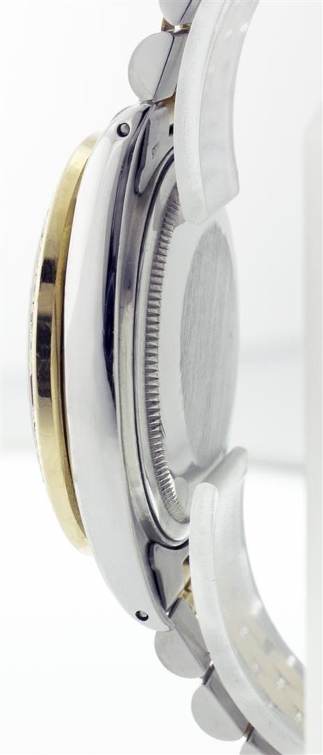 One Gents Two Tone Rolex Datejust Polished, Serviced & Electronically Tested, 14K Yellow Gold & Stainless Steel Case:36mm, 14K Yellow Gold Crown, Custom Bezel: 18K Yellow Gold Ruby Beadset Diamond Bezel, Diamond Count: 36 Diamonds + 4 Ruby Total Weight 1.0 Carat, Clarity: Si-VS, Color: G to H. Custom Crystal: Synthetic Sapphire Cyclops Lens. Movement: Automatic Winding Movement Caliber 3035. Custom Dial: Black Diamond Dial, Diamond Count: 10 Diamonds, Color: G to H, Clarity: SI-VS Date Window: 3 O'Clock Position Date Display, Quickset, Model: 16013 Condition: G-6 Extra Fine. Bracelet: Two Tone 14K Yellow Gold & Stainless Steel Jubilee. Bright Polish. 6.5 Inch Length, Adjustable. Standard Clasp, With Rolex Logo.