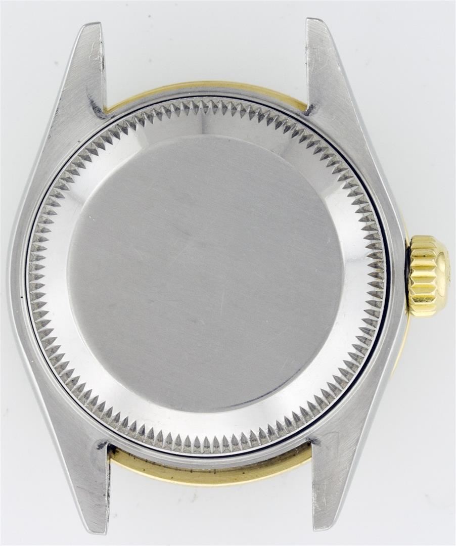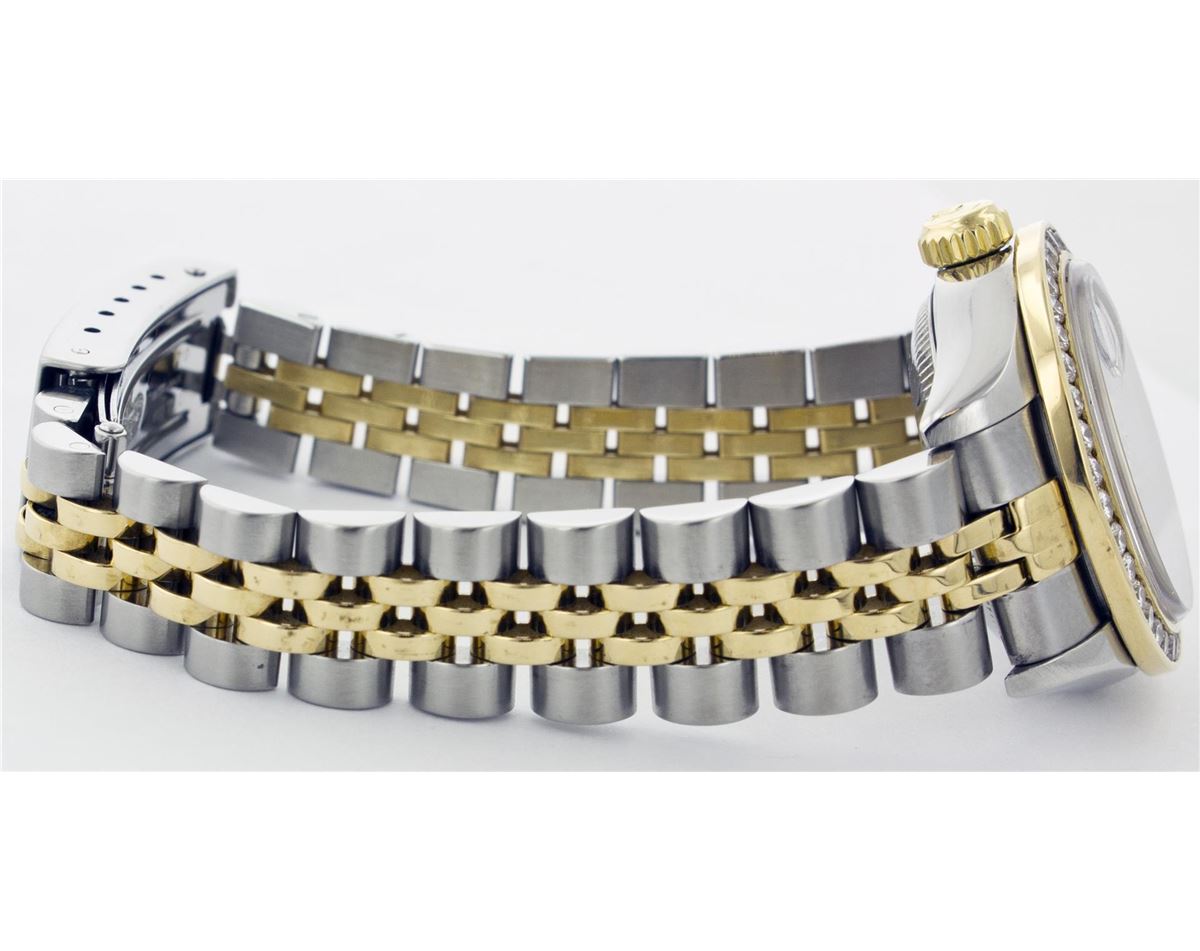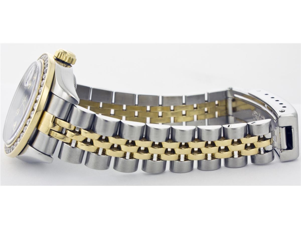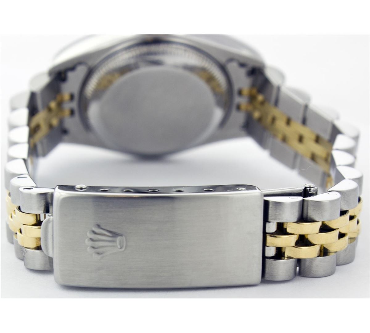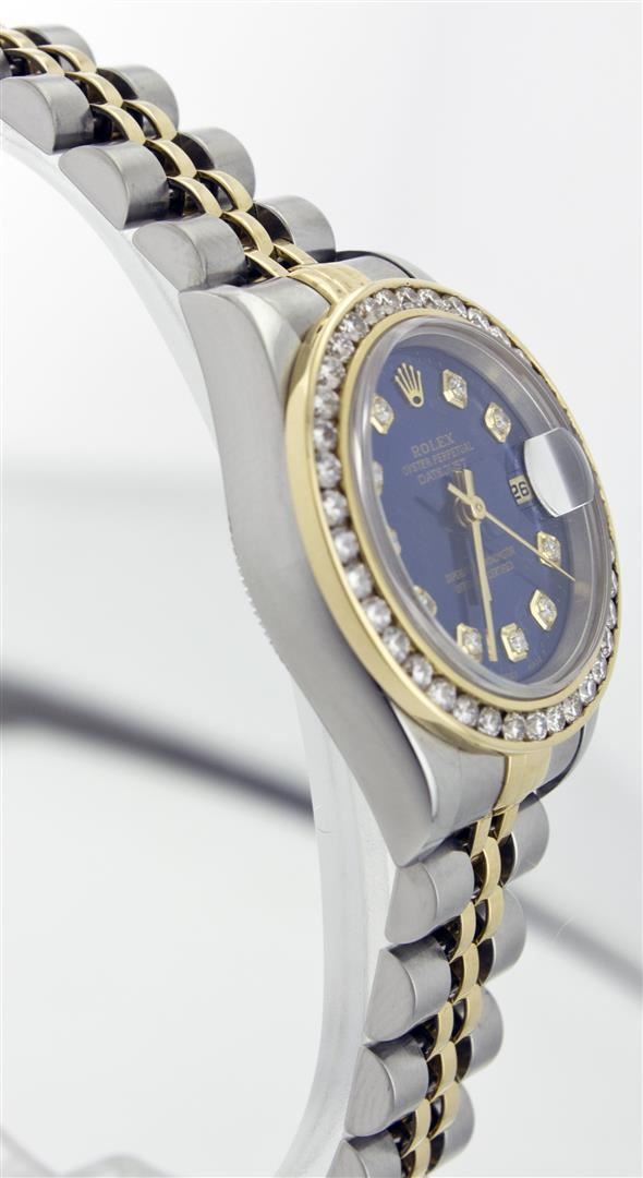 One Ladies Two Tone Rolex Datejust Polished, Serviced & Electronically Tested, 14K Yellow Gold & Stainless Steel Case:26mm, 14K Yellow Gold Crown, Custom Bezel: 18K Yellow Gold Channel Set Diamond Bezel, Diamond Count: 44 Diamonds Total Weight 1.00 Carat, Clarity: Si-VS, Color: G to H. Custom Crystal: Synthetic Sapphire Cyclops Lens. Movement: Automatic Winding Movement Caliber 2030. Custom Dial: Blue Diamond Dial, Stone Count: 10 Diamonds. Date Window: 3 O'Clock Position Date Display, Non Quickset, Model: 6917 Condition: G-6 Extra Fine. Bracelet: Two Tone 14K Yellow Gold & Stainless Steel Jubilee. Bright Polish. 5.5 Inch Length, Adjustable. Standard Clasp, With Rolex Logo.