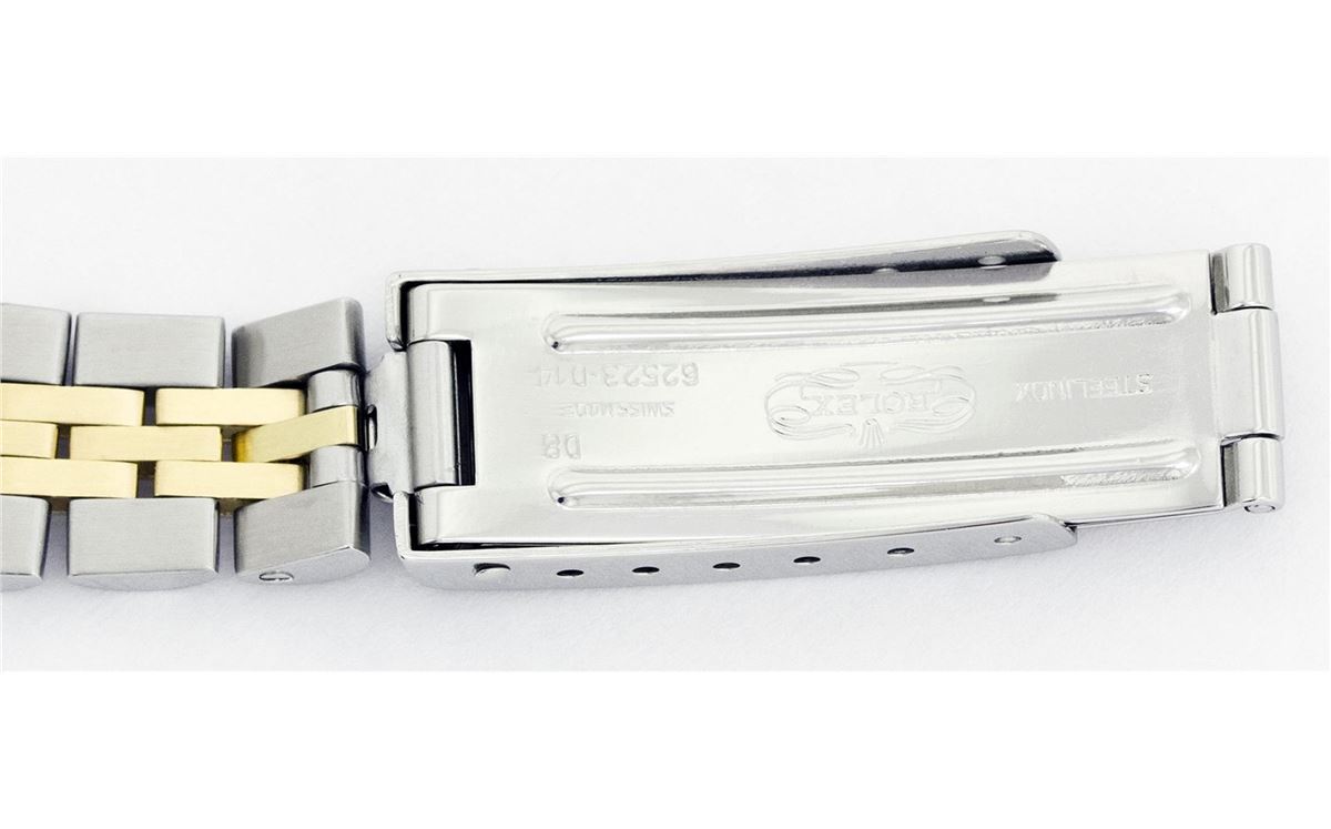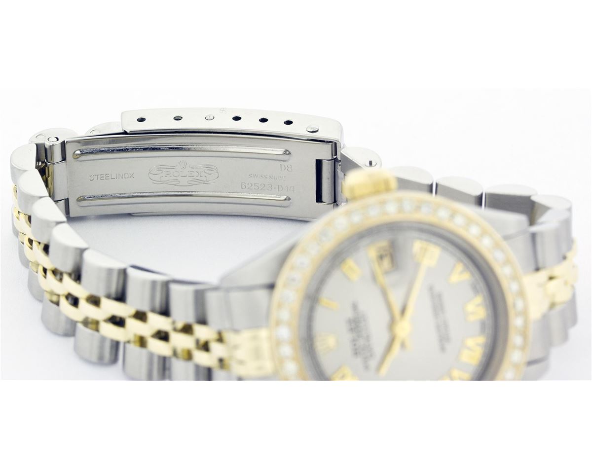 One Ladies Two Tone Rolex Datejust Polished, Serviced & Electronically Tested, 14K Yellow Gold & Stainless Steel Case:26mm, 14K Yellow Gold Crown, Custom Bezel: 18K Yellow Gold Beadset Diamond Bezel, Diamond Count: 32 Diamonds Total Weight 1.00 Carat, Clarity: Si-VS, Color: G to H. Custom Crystal: Synthetic Sapphire Cyclops Lens. Movement: Automatic Winding Movement Caliber 2030. Custom Dial: Slate Grey With Roman Hour Markers. Date Window: 3 O'Clock Position Date Display, Non Quickset, Model: 6917 Condition: G-6 Extra Fine. Bracelet: Two Tone 14K Yellow Gold & Stainless Steel Jubilee. Bright Polish. 5.5 Inch Length, Adjustable. Standard Clasp, With Rolex Logo.
