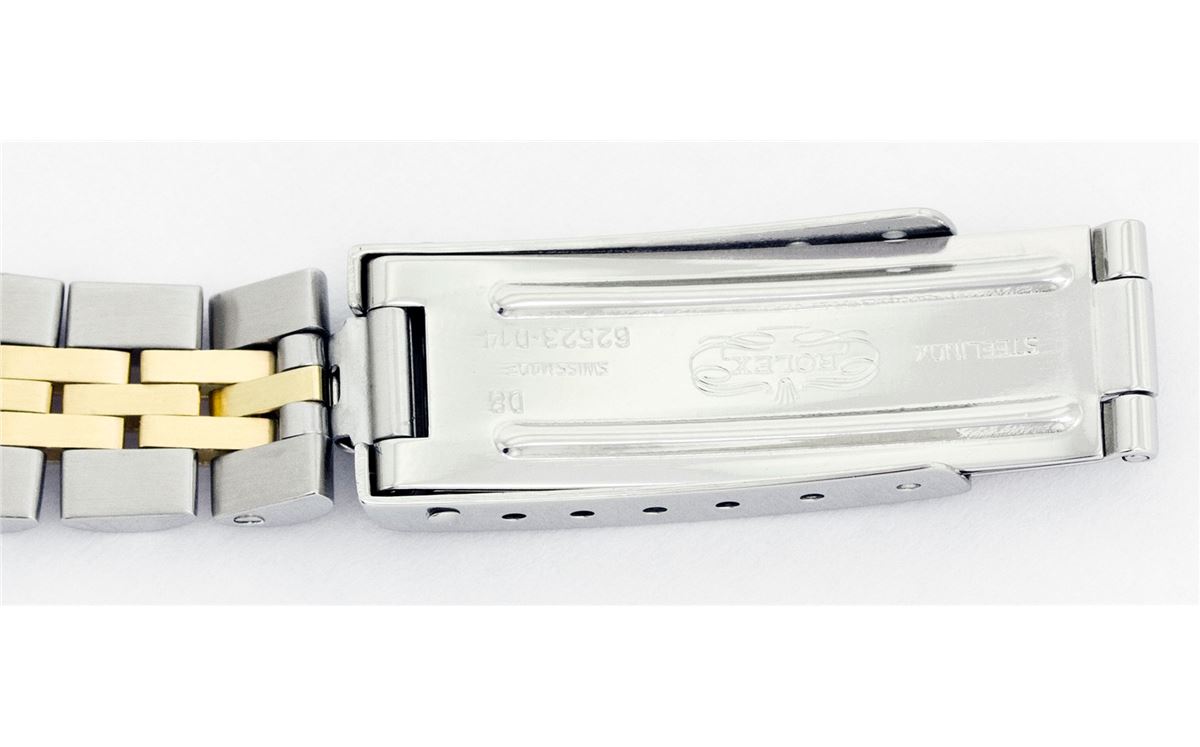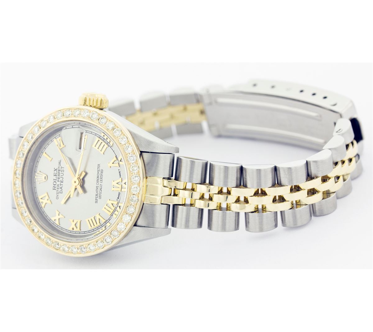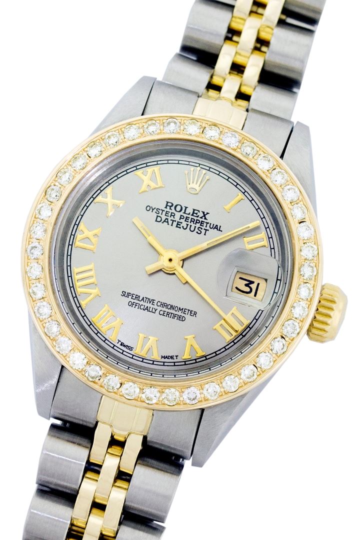 One Ladies Two Tone Rolex Datejust Polished, Serviced & Electronically Tested, 14K Yellow Gold & Stainless Steel Case:26mm, 14K Yellow Gold Crown, Custom Bezel: 18K Yellow Gold Beadset Diamond Bezel, Diamond Count: 32 Diamonds Total Weight 1.00 Carat, Clarity: Si-VS, Color: G to H. Custom Crystal: Synthetic Sapphire Cyclops Lens. Movement: Automatic Winding Movement Caliber 2030. Custom Dial: Slate Grey With Roman Hour Markers. Date Window: 3 O'Clock Position Date Display, Non Quickset, Model: 6917 Condition: G-6 Extra Fine. Bracelet: Two Tone 14K Yellow Gold & Stainless Steel Jubilee. Bright Polish. 5.5 Inch Length, Adjustable. Standard Clasp, With Rolex Logo.