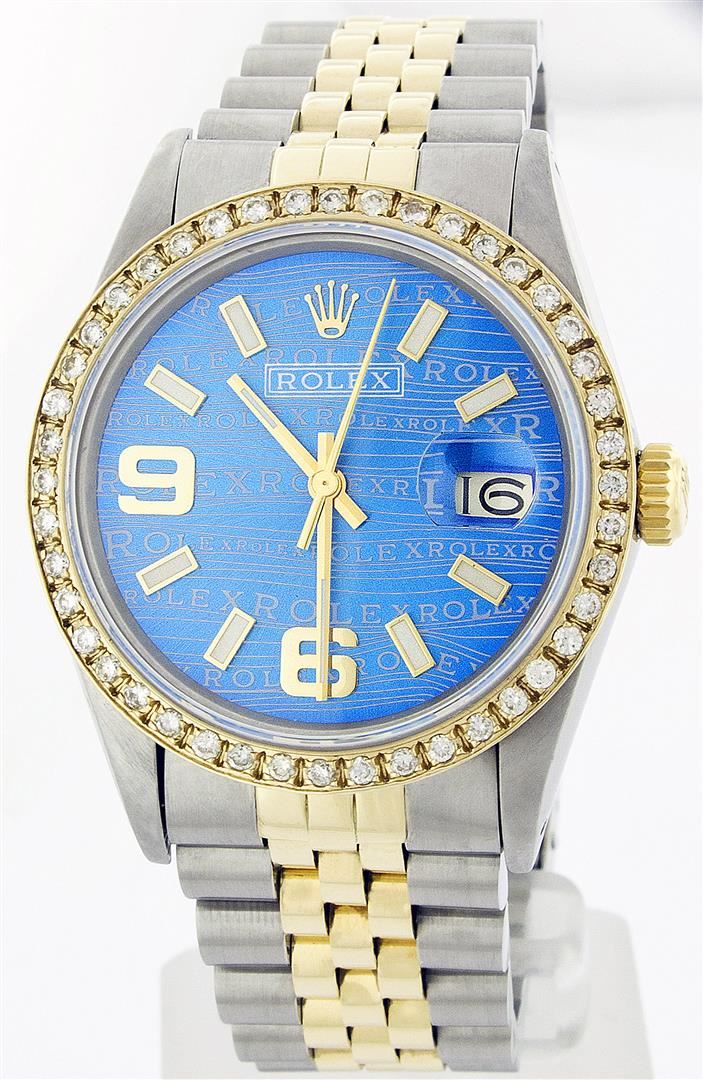 One Gents Two Tone Rolex Datejust Polished, Serviced & Electronically Tested, 14K Yellow Gold & Stainless Steel Case:36mm, 14K Yellow Gold Crown, Custom Bezel: 18K Yellow Gold Beadset Diamond Bezel, Diamond Count: 44 Diamonds Total Weight 1.0 Carat, Clarity: Si-VS, Color: G to H. Custom Crystal: Synthetic Sapphire Cyclops Lens. Movement: Automatic Winding Movement Caliber 3035. Custom Dial: Blue Wave Dial With Index Hour Markers. Date Window: 3 O'Clock Position Date Display, Quickset, Model: 16013 Condition: G-6 Extra Fine. Bracelet: Two Tone 14K Yellow Gold & Stainless Steel Jubilee. Bright Polish. 6.5 Inch Length, Adjustable. Standard Clasp, With Rolex Logo.