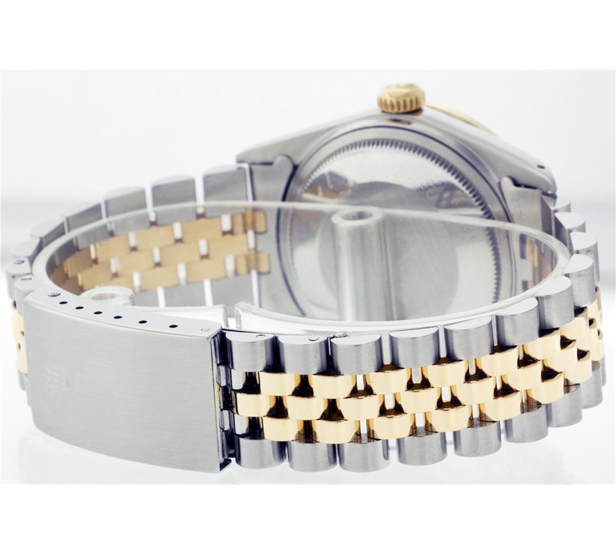 One Mens Two Tone Rolex Datejust Polished, Serviced & Electronically Tested, 14K Yellow Gold & Stainless Steel Case:36mm, 14K Yellow Gold Crown, Custom Bezel: 18K Yellow Gold Beadset Diamond Bezel, Diamond Count: 44 Diamonds Total Weight 1.00 Carat, Clarity: Si-VS, Color: G to H. Custom Crystal: Synthetic Sapphire Cyclops Lens. Movement: Automatic Winding Movement Caliber 3035. Custom Dial: Mother Of Pearl Dial Set With Diamond Hour Markers, 8 Diamonds + 2 Sapphire Baguettes in Dial G To H In Color , Date Window: 3 O'Clock Position Date Display, Quickset, Model: 16013 Condition: G-6 Extra Fine. Bracelet: Two Tone 14K Yellow Gold & Stainless Steel Jubilee. Bright Polish. 6.5 Inch Length, Adjustable. Standard Clasp, With Rolex Logo.