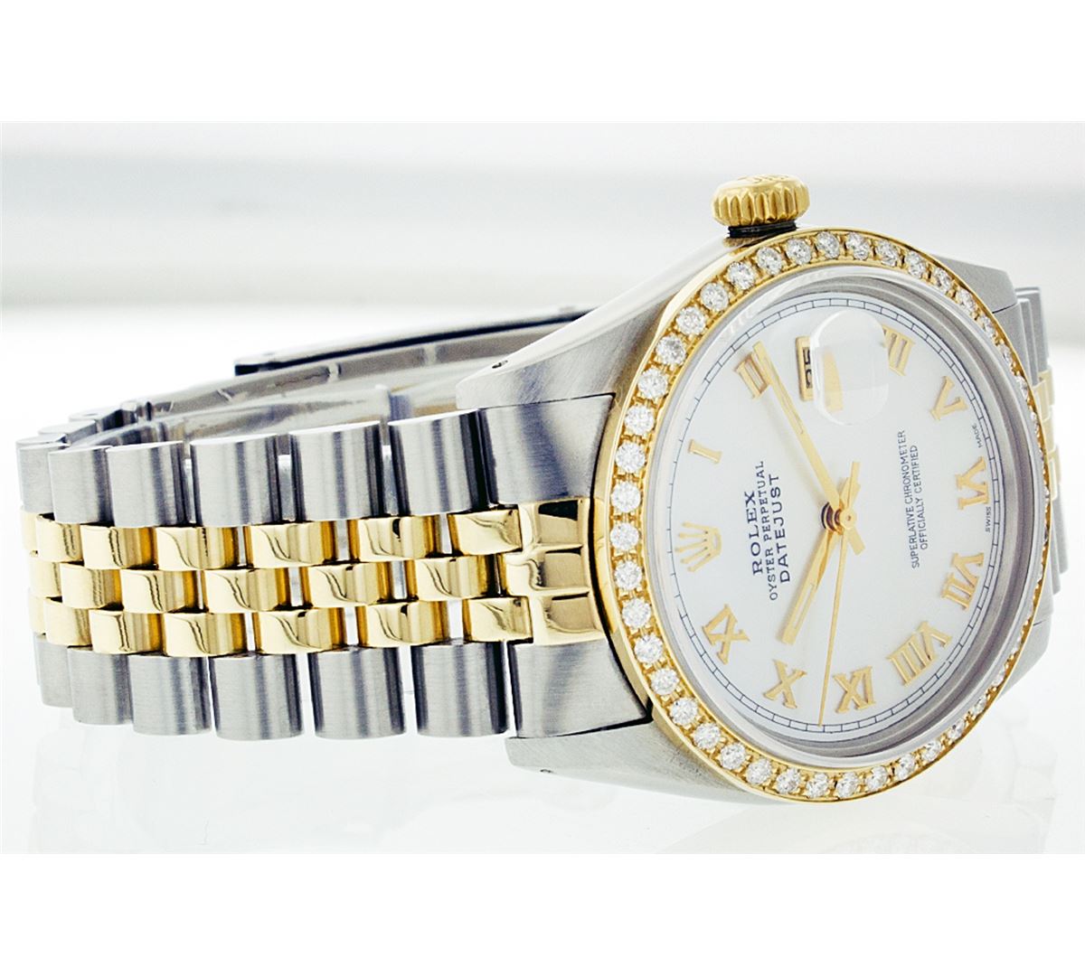One Mens Two Tone Rolex Datejust Polished, Serviced & Electronically Tested, 14K Yellow Gold & Stainless Steel Case:36mm, 14K Yellow Gold Crown, Custom Bezel: 18K Yellow Gold Beadset Diamond Bezel, Diamond Count: 44 Diamonds Total Weight 1.00 Carat, Clarity: Si-VS, Color: G to H. Custom Crystal: Synthetic Sapphire Cyclops Lens. Movement: Automatic Winding Movement Caliber 3035. Custom Dial: Mother Of PearlWith Roman Hour Markers. Date Window: 3 O'Clock Position Date Display, Quickset, Model: 16013 Condition: G-6 Extra Fine. Bracelet: Two Tone 14K Yellow Gold & Stainless Steel Jubilee. Bright Polish. 6.5 Inch Length, Adjustable. Standard Clasp, With Rolex Logo.