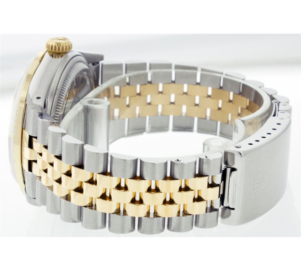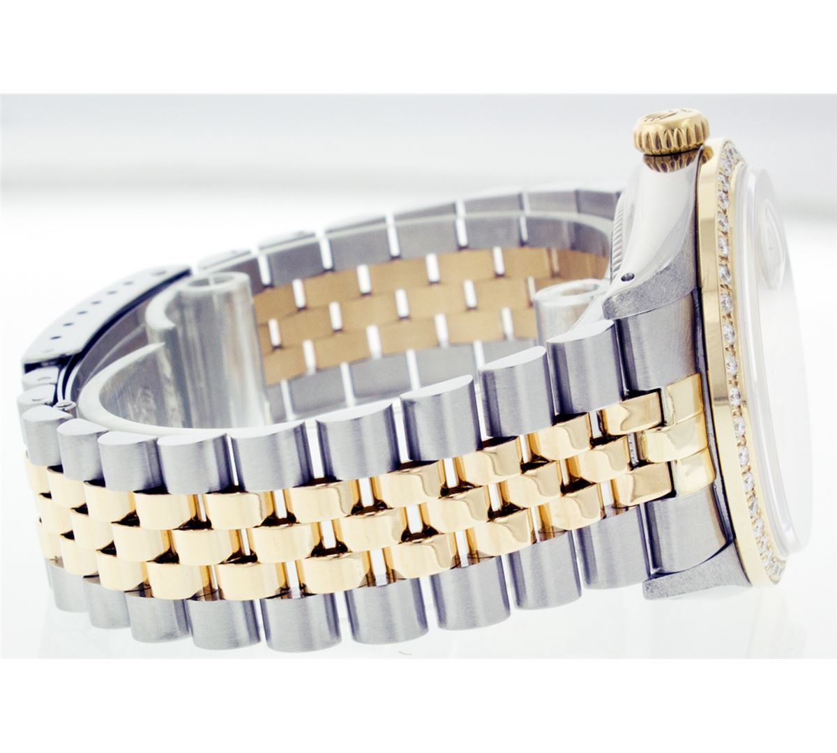 One Mens Two Tone Rolex Datejust Polished, Serviced & Electronically Tested, 14K Yellow Gold & Stainless Steel Case:36mm, 14K Yellow Gold Crown, Custom Bezel: 18K Yellow Gold Beadset Diamond Bezel, Diamond Count: 44 Diamonds Total Weight 1.00 Carat, Clarity: Si-VS, Color: G to H. Custom Crystal: Synthetic Sapphire Cyclops Lens. Movement: Automatic Winding Movement Caliber 3035. Custom Dial: Champagne Dial Set With Diamond Hour Markers and Baguette Diamonds On The Six And Nine Hour Marker, 8 Diamonds + 2 Baguettes in Dial G To H In Color, Si-VS Clarity. Date Window: 3 O'Clock Position Date Display, Quickset, Model: 16013 Condition: G-6 Extra Fine. Bracelet: Two Tone 14K Yellow Gold & Stainless Steel Jubilee. Bright Polish. 6.5 Inch Length, Adjustable. Standard Clasp, With Rolex Logo.
