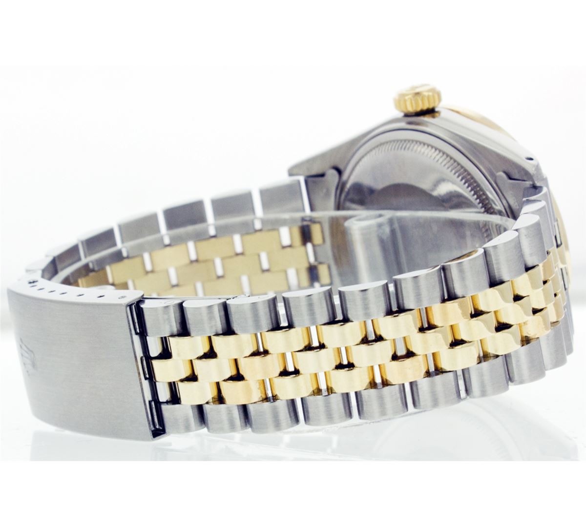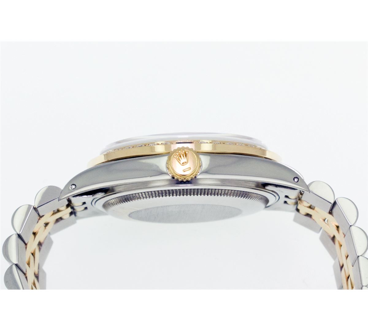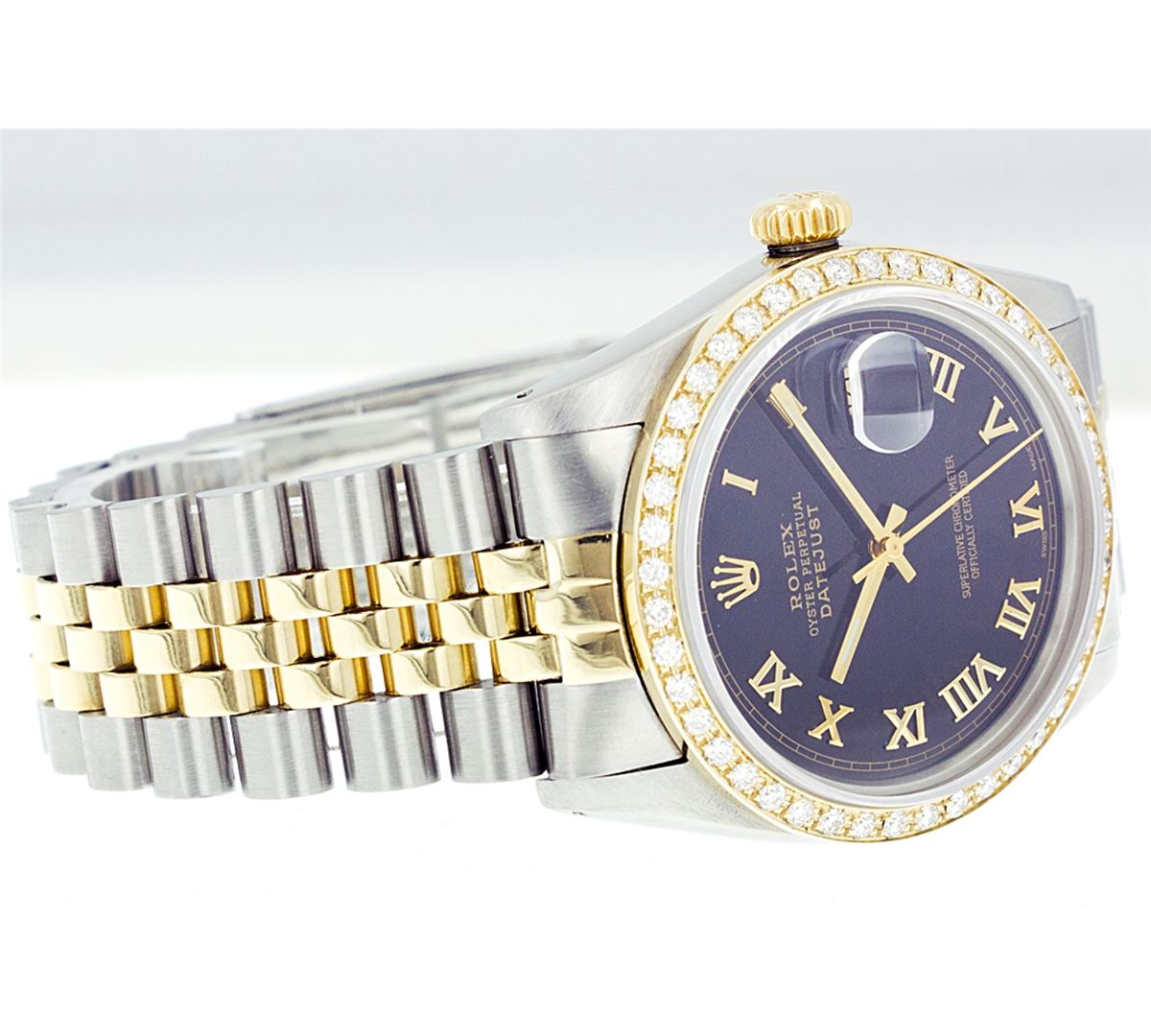 One Mens Two Tone Rolex Datejust Polished, Serviced & Electronically Tested, 14K Yellow Gold & Stainless Steel Case:36mm, 14K Yellow Gold Crown, Custom Bezel: 18K Yellow Gold Beadset Diamond Bezel, Diamond Count: 44 Diamonds Total Weight 1.00 Carat, Clarity: Si-VS, Color: G to H. Custom Crystal: Synthetic Sapphire Cyclops Lens. Movement: Automatic Winding Movement Caliber 3035. Custom Dial: Black Dial With Roman Hour Markers. Date Window: 3 O'Clock Position Date Display, Quickset, Model: 16013 Condition: Excellent, G-6 Extra Fine. Bracelet: Two Tone 14K Yellow Gold & Stainless Steel Jubilee. Bright Polish. 6.5 Inch Length, Adjustable. Standard Clasp, With Rolex Logo.