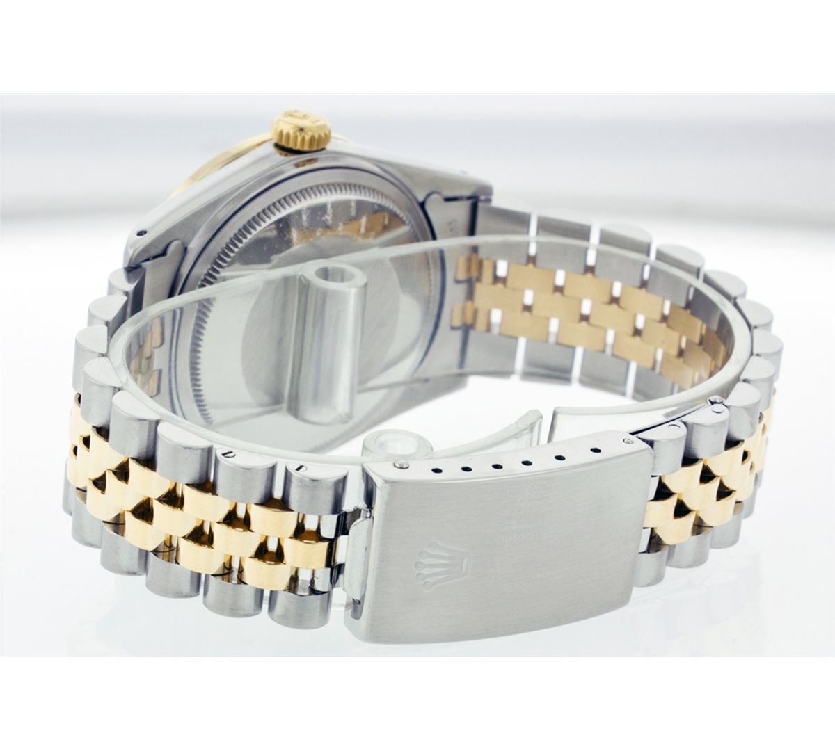 One Mens Two Tone Rolex Datejust Polished, Serviced & Electronically Tested, 14K Yellow Gold & Stainless Steel Case:36mm, 14K Yellow Gold Crown, Custom Bezel: 18K Yellow Gold Beadset Diamond Bezel, Diamond Count: 44 Diamonds Total Weight 1.00 Carat, Clarity: Si-VS, Color: G to H. Custom Crystal: Synthetic Sapphire Cyclops Lens. Movement: Automatic Winding Movement Caliber 3035. Custom Dial: Salmon Dial With Diamond Hour Markers. Diamond Count: 10 Diamonds, Color: G to H, Clarity: SI-VS Date Window: 3 O'Clock Position Date Display, Quickset, Model: 16013 Condition: Excellent, G-6 Extra Fine. Bracelet:Two Tone 14K Yellow Gold & Stainless Steel Jubilee. Bright Polish. 6.5 Inch Length, Adjustable. Standard Clasp, With Rolex Logo.
