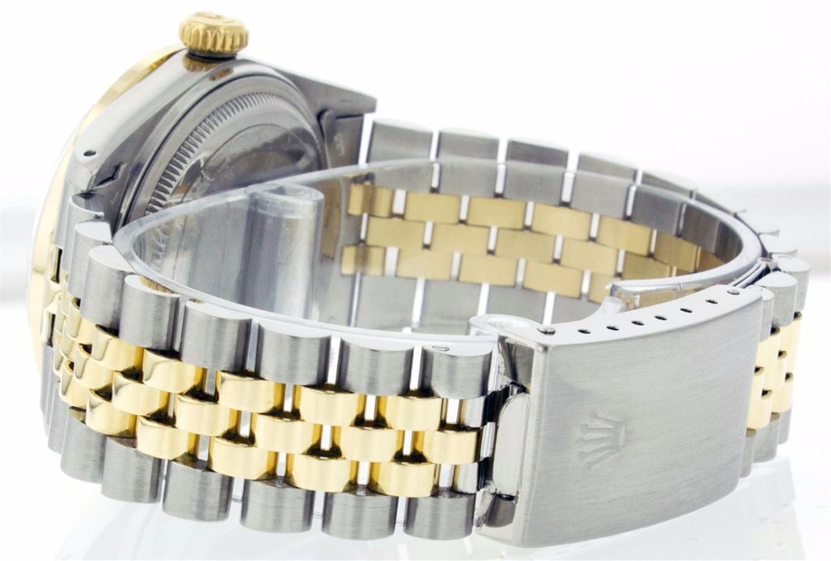 One Mens Two Tone Rolex Datejust Polished, Serviced & Electronically Tested, 14K Yellow Gold & Stainless Steel Case:36mm, 14K Yellow Gold Crown, Custom Bezel: 18K Yellow Gold Beadset Diamond Bezel, Diamond Count: 44 Diamonds Total Weight 1.00 Carat, Clarity: Si-VS, Color: G to H. Custom Crystal: Synthetic Sapphire Cyclops Lens. Movement: Automatic Winding Movement Caliber 3035. Custom Dial: Mother Of Pearl With Roman Hour Markers. Date Window: 3 O'Clock Position Date Display, Quickset, Model: 16013 Condition: G-6 Extra Fine. Bracelet: Two Tone 14K Yellow Gold & Stainless Steel Jubilee. Bright Polish. 6.5 Inch Length, Adjustable. Standard Clasp, With Rolex Logo.