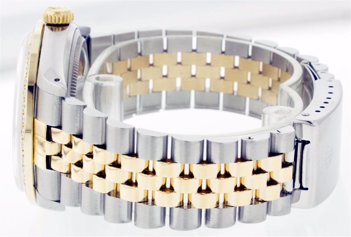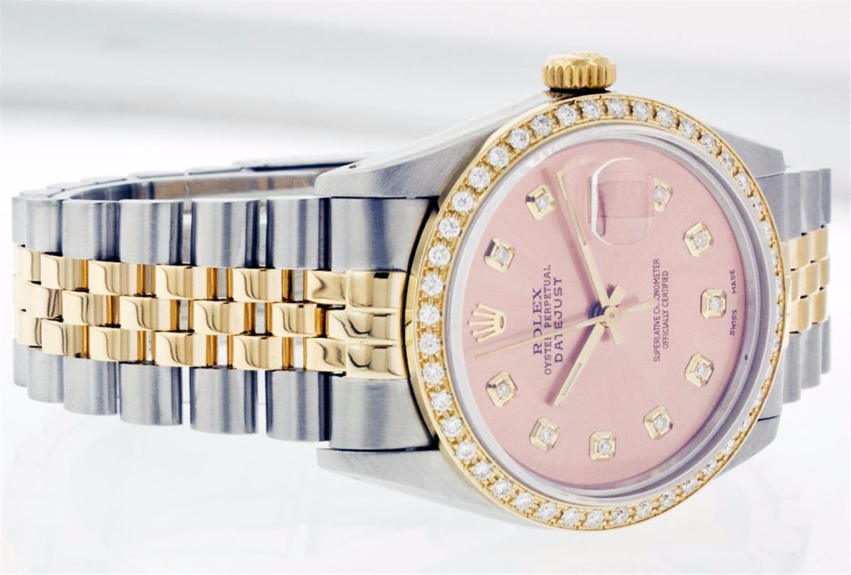 One Mens Two Tone Rolex Datejust Polished, Serviced & Electronically Tested, 14K Yellow Gold & Stainless Steel Case:36mm, 14K Yellow Gold Crown, Custom Bezel: 18K Yellow Gold Beadset Diamond Bezel, Diamond Count: 44 Diamonds Total Weight 1.00 Carat, Clarity: Si-VS, Color: G to H. Custom Crystal: Synthetic Sapphire Cyclops Lens. Movement: Automatic Winding Movement Caliber 3035. Custom Dial: Salmon Dial With Diamond Hour Markers. Diamond Count: 10 Diamonds, Color: G to H, Clarity: SI-VS Date Window: 3 O'Clock Position Date Display, Quickset, Model: 16013 Condition: Excellent, G-6 Extra Fine. Bracelet:Two Tone 14K Yellow Gold & Stainless Steel Jubilee. Bright Polish. 6.5 Inch Length, Adjustable. Standard Clasp, With Rolex Logo.