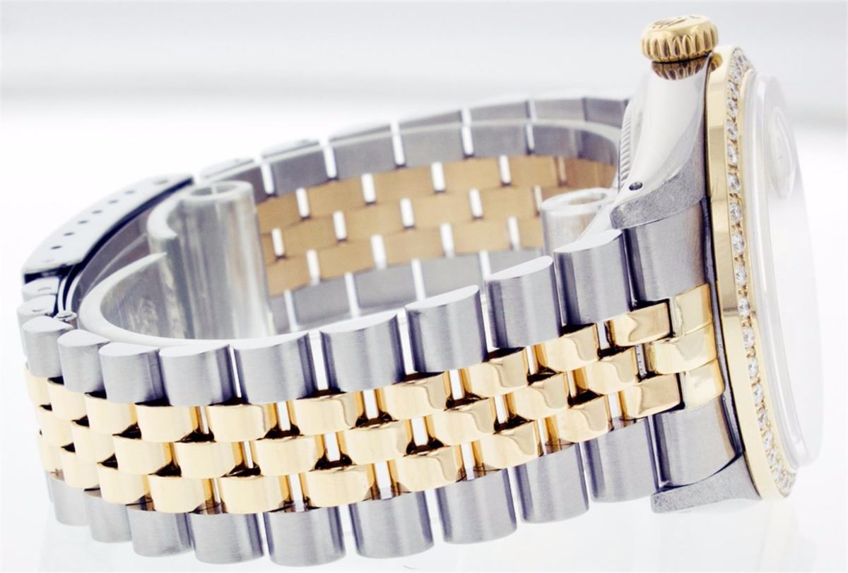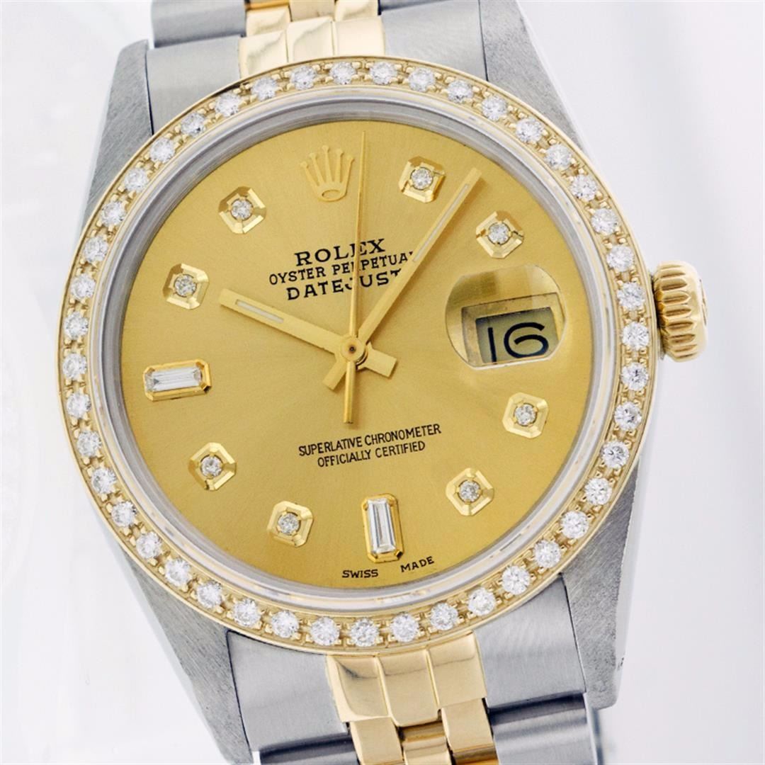 One Mens Two Tone Rolex Datejust Polished, Serviced & Electronically Tested, 14K Yellow Gold & Stainless Steel Case:36mm, 14K Yellow Gold Crown, Custom Bezel: 18K Yellow Gold Beadset Diamond Bezel, Diamond Count: 44 Diamonds Total Weight 1.00 Carat, Clarity: Si-VS, Color: G to H. Custom Crystal: Synthetic Sapphire Cyclops Lens. Movement: Automatic Winding Movement Caliber 3035. Custom Dial: Champagne Dial Set With Diamond Hour Markers and Baguette Diamonds On The Six And Nine Hour Marker, 8 Diamonds + 2 Baguettes in Dial G To H In Color, Si-VS Clarity. Date Window: 3 O'Clock Position Date Display, Quickset, Model: 16013 Condition: G-6 Extra Fine. Bracelet: Two Tone 14K Yellow Gold & Stainless Steel Jubilee. Bright Polish. 6.5 Inch Length, Adjustable. Standard Clasp, With Rolex Logo.