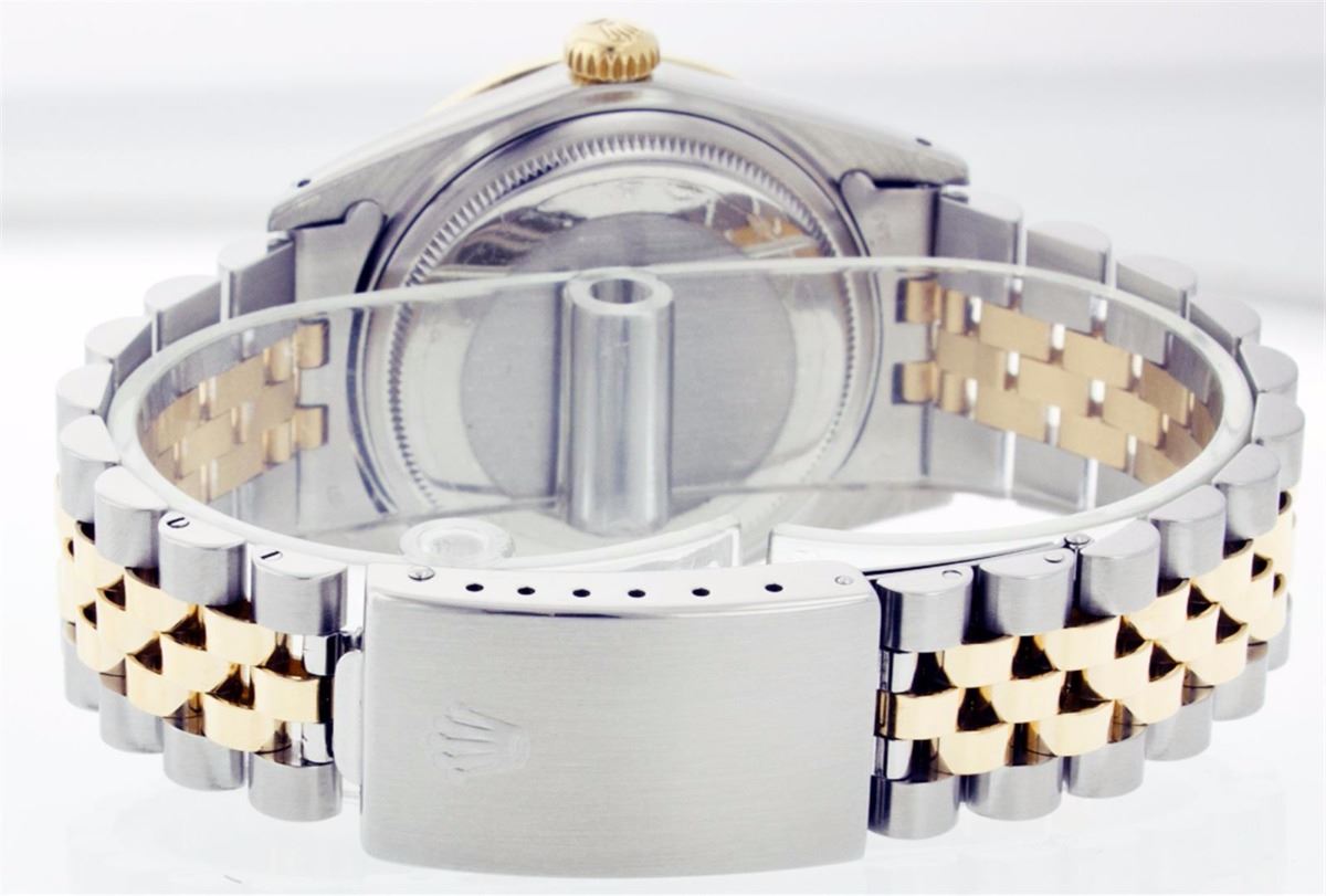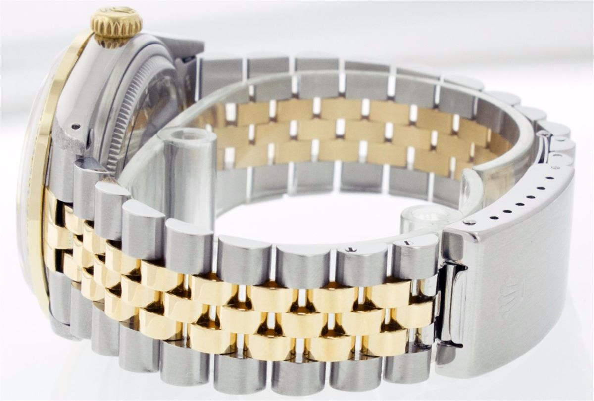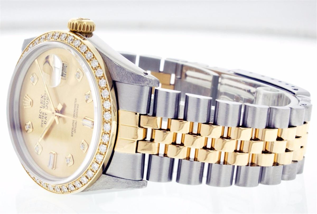 One Mens Two Tone Rolex Datejust Polished, Serviced & Electronically Tested, 14K Yellow Gold & Stainless Steel Case:36mm, 14K Yellow Gold Crown, Custom Bezel: 18K Yellow Gold Beadset Diamond Bezel, Diamond Count: 44 Diamonds Total Weight 1.00 Carat, Clarity: Si-VS, Color: G to H. Custom Crystal: Synthetic Sapphire Cyclops Lens. Movement: Automatic Winding Movement Caliber 3035. Custom Dial: Champagne Dial Set With Diamond Hour Markers and Baguette Diamonds On The Six And Nine Hour Marker, 8 Diamonds + 2 Baguettes in Dial G To H In Color, Si-VS Clarity. Date Window: 3 O'Clock Position Date Display, Quickset, Model: 16013 Condition: G-6 Extra Fine. Bracelet: Two Tone 14K Yellow Gold & Stainless Steel Jubilee. Bright Polish. 6.5 Inch Length, Adjustable. Standard Clasp, With Rolex Logo.