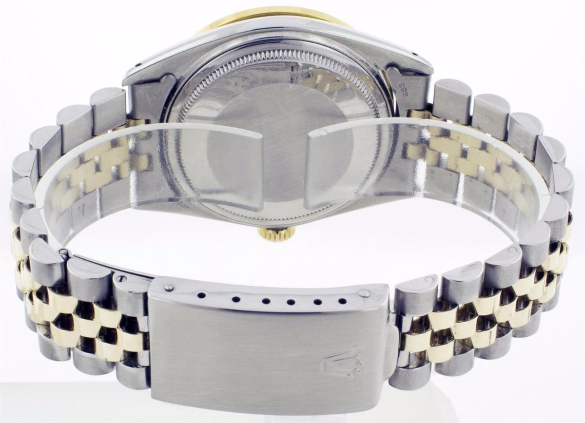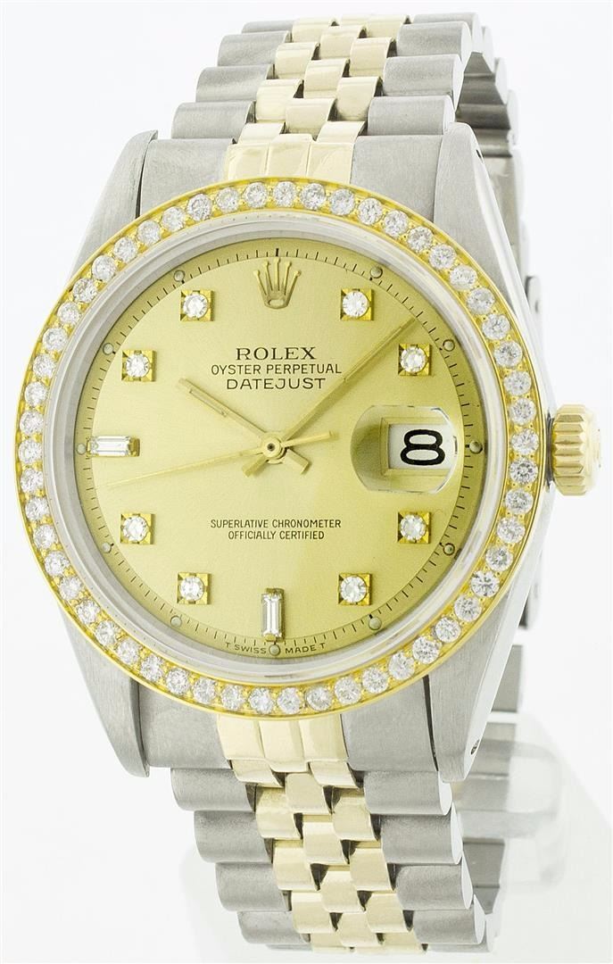 One Gents Two Tone Rolex Datejust Polished, Serviced & Electronically Tested, 14K Yellow Gold & Stainless Steel Case:36mm, 14K Yellow Gold Crown, Custom Bezel: 18K Yellow Gold Beadset Diamond Bezel, Diamond Count: 44 Diamonds Total Weight 1.0 Carat, Clarity: Si-VS, Color: G to H. Custom Crystal: Synthetic Sapphire Cyclops Lens. Movement: Automatic Winding Movement Caliber 3035. Custom Dial: Champagne Diamond Dial, Diamond Count: 8 Diamonds + 2 Baguette, Color: G to H, Clarity: SI-VS Date Window: 3 O'Clock Position Date Display, Quickset, Model: 16013 Condition: G-6 Extra Fine. Bracelet: Two Tone 14K Yellow Gold & Stainless Steel Jubilee. Bright Polish. 6.5 Inch Length, Adjustable. Standard Clasp, With Rolex Logo.