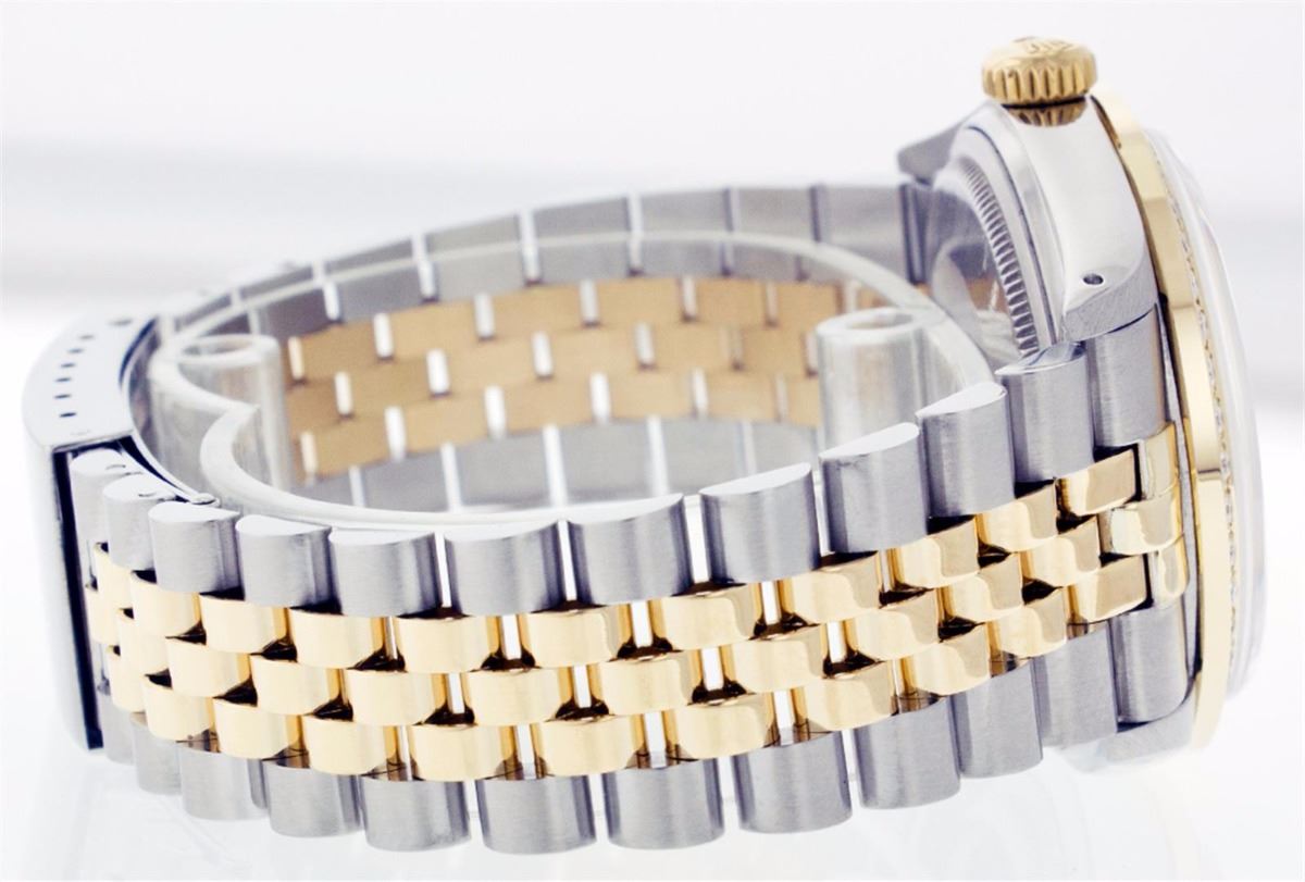 One Mens Two Tone Rolex Datejust Polished, Serviced & Electronically Tested, 14K Yellow Gold & Stainless Steel Case:36mm, 14K Yellow Gold Crown, Custom Bezel: 18K Yellow Gold Beadset Diamond Bezel, Diamond Count: 44 Diamonds Total Weight 1.00 Carat, Clarity: Si-VS, Color: G to H. Custom Crystal: Synthetic Sapphire Cyclops Lens. Movement: Automatic Winding Movement Caliber 3035. Custom Dial: Mother Of Pearl Dial Set With Diamond Hour Markers, 8 Diamonds + 2 Sapphire Baguettes in Dial G To H In Color , Date Window: 3 O'Clock Position Date Display, Quickset, Model: 16013 Condition: G-6 Extra Fine. Bracelet: Two Tone 14K Yellow Gold & Stainless Steel Jubilee. Bright Polish. 6.5 Inch Length, Adjustable. Standard Clasp, With Rolex Logo.