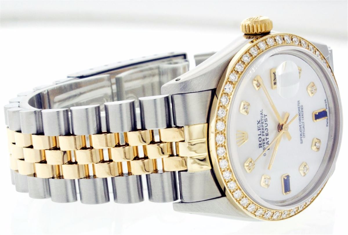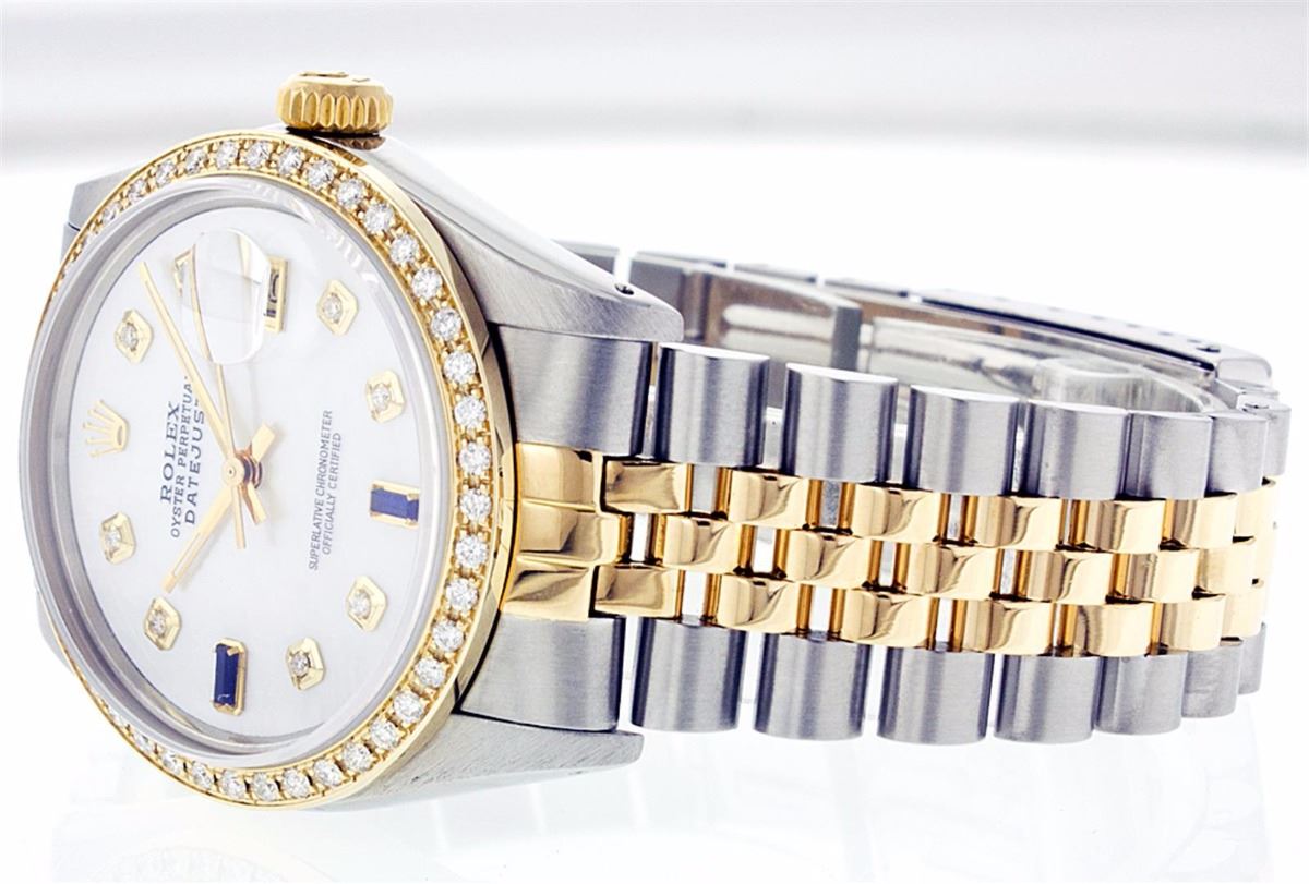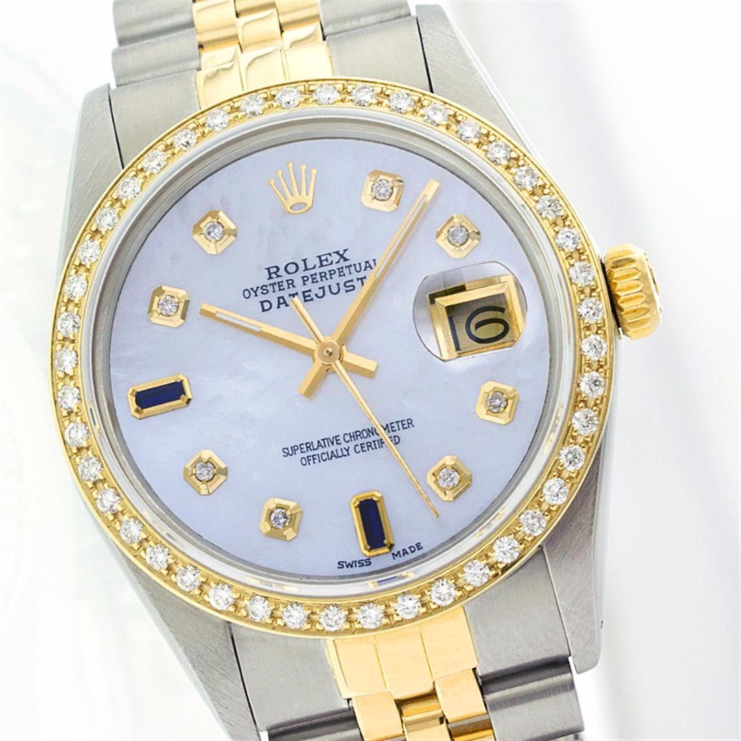 One Mens Two Tone Rolex Datejust Polished, Serviced & Electronically Tested, 14K Yellow Gold & Stainless Steel Case:36mm, 14K Yellow Gold Crown, Custom Bezel: 18K Yellow Gold Beadset Diamond Bezel, Diamond Count: 44 Diamonds Total Weight 1.00 Carat, Clarity: Si-VS, Color: G to H. Custom Crystal: Synthetic Sapphire Cyclops Lens. Movement: Automatic Winding Movement Caliber 3035. Custom Dial: Mother Of Pearl Dial Set With Diamond Hour Markers, 8 Diamonds + 2 Sapphire Baguettes in Dial G To H In Color , Date Window: 3 O'Clock Position Date Display, Quickset, Model: 16013 Condition: G-6 Extra Fine. Bracelet: Two Tone 14K Yellow Gold & Stainless Steel Jubilee. Bright Polish. 6.5 Inch Length, Adjustable. Standard Clasp, With Rolex Logo.