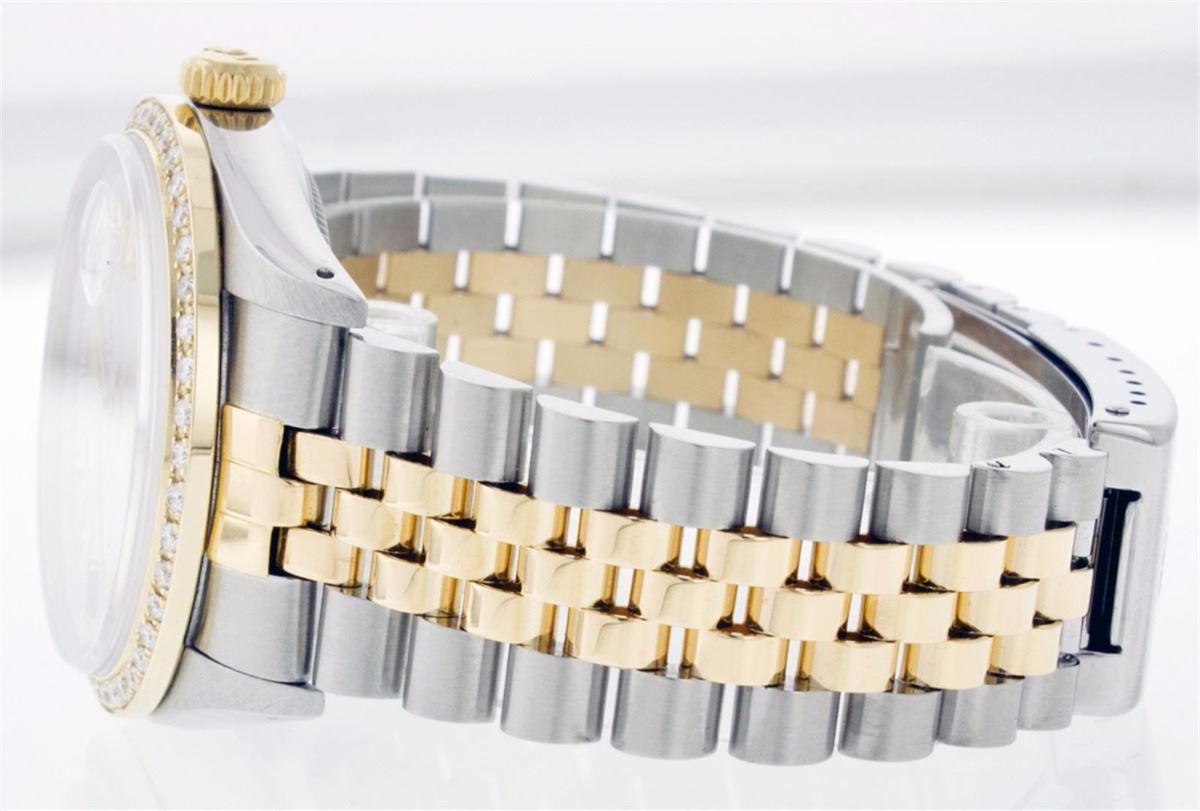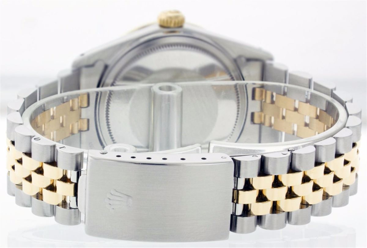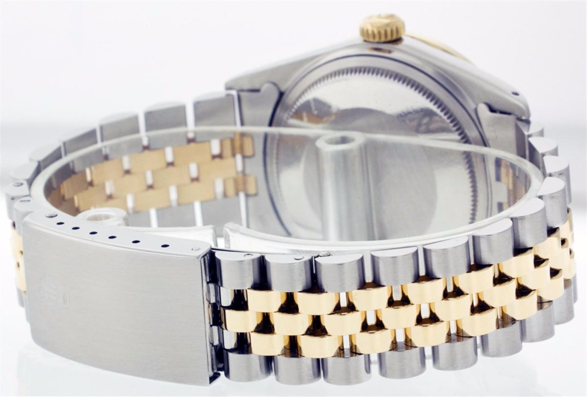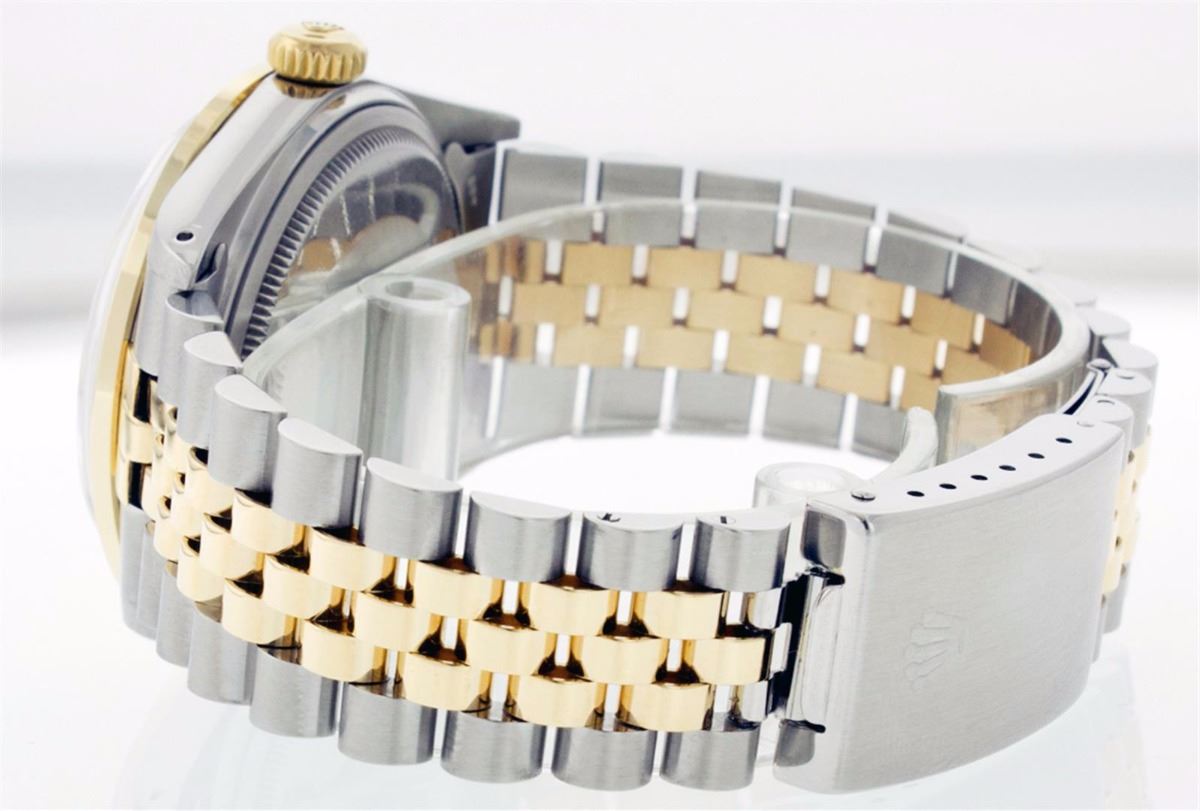 One Mens Two Tone Rolex Datejust Polished, Serviced & Electronically Tested, 14K Yellow Gold & Stainless Steel Case:36mm, 14K Yellow Gold Crown, Custom Bezel: 18K Yellow Gold Beadset Diamond Bezel, Diamond Count: 44 Diamonds Total Weight 1.00 Carat, Clarity: Si-VS, Color: G to H. Custom Crystal: Synthetic Sapphire Cyclops Lens. Movement: Automatic Winding Movement Caliber 3035. Custom Dial: Mother Of Pearl Dial Set With Diamond Hour Markers, 8 Diamonds + 2 Sapphire Baguettes in Dial G To H In Color , Date Window: 3 O'Clock Position Date Display, Quickset, Model: 16013 Condition: G-6 Extra Fine. Bracelet: Two Tone 14K Yellow Gold & Stainless Steel Jubilee. Bright Polish. 6.5 Inch Length, Adjustable. Standard Clasp, With Rolex Logo.