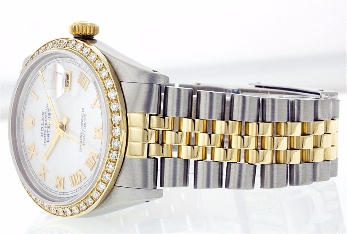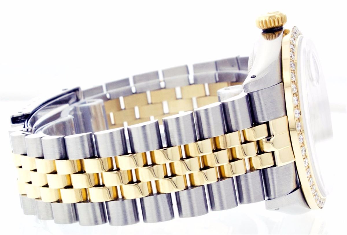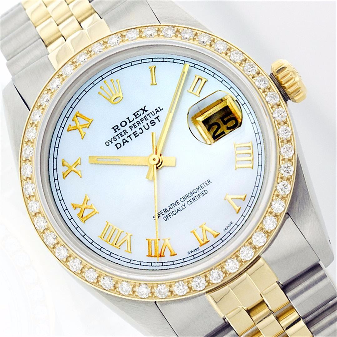 One Mens Two Tone Rolex Datejust Polished, Serviced & Electronically Tested, 14K Yellow Gold & Stainless Steel Case:36mm, 14K Yellow Gold Crown, Custom Bezel: 18K Yellow Gold Beadset Diamond Bezel, Diamond Count: 44 Diamonds Total Weight 1.00 Carat, Clarity: Si-VS, Color: G to H. Custom Crystal: Synthetic Sapphire Cyclops Lens. Movement: Automatic Winding Movement Caliber 3035. Custom Dial: Mother Of Pearl With Roman Hour Markers. Date Window: 3 O'Clock Position Date Display, Quickset, Model: 16013 Condition: G-6 Extra Fine. Bracelet: Two Tone 14K Yellow Gold & Stainless Steel Jubilee. Bright Polish. 6.5 Inch Length, Adjustable. Standard Clasp, With Rolex Logo.