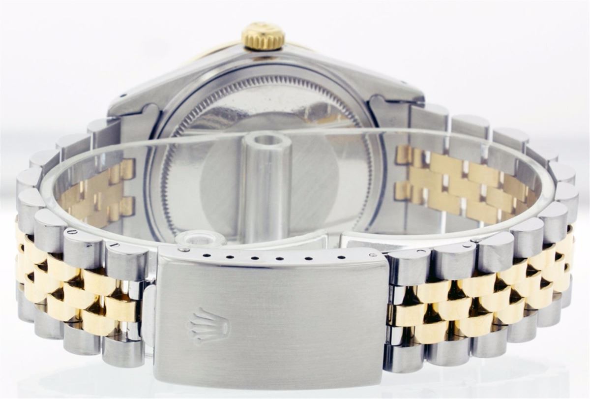 One Mens Two Tone Rolex Datejust Polished, Serviced & Electronically Tested, 14K Yellow Gold & Stainless Steel Case:36mm, 14K Yellow Gold Crown, Custom Bezel: 18K Yellow Gold Beadset Diamond Bezel, Diamond Count: 44 Diamonds Total Weight 1.00 Carat, Clarity: Si-VS, Color: G to H. Custom Crystal: Synthetic Sapphire Cyclops Lens. Movement: Automatic Winding Movement Caliber 3035. Custom Dial: Salmon Dial With Diamond Hour Markers. Diamond Count: 10 Diamonds, Color: G to H, Clarity: SI-VS Date Window: 3 O'Clock Position Date Display, Quickset, Model: 16013 Condition: Excellent, G-6 Extra Fine. Bracelet:Two Tone 14K Yellow Gold & Stainless Steel Jubilee. Bright Polish. 6.5 Inch Length, Adjustable. Standard Clasp, With Rolex Logo.