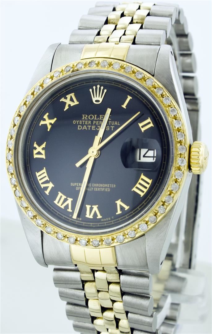 One Gents Two Tone Rolex Datejust Polished, Serviced & Electronically Tested, 14K Yellow Gold & Stainless Steel Case:36mm, 14K Yellow Gold Crown, Custom Bezel: 18K Yellow Gold Beadset Diamond Bezel, Diamond Count: 44 Diamonds Total Weight 1.0 Carat, Clarity: Si-VS, Color: G to H. Custom Crystal: Synthetic Sapphire Cyclops Lens. Movement: Automatic Winding Movement Caliber 3035. Custom Dial: Black Roman Dial. Date Window: 3 O'Clock Position Date Display, Quickset, Model: 16013 Condition: G-6 Extra Fine. Bracelet: Two Tone 14K Yellow Gold & Stainless Steel Jubilee. Bright Polish. 6.5 Inch Length, Adjustable. Standard Clasp, With Rolex Logo.
