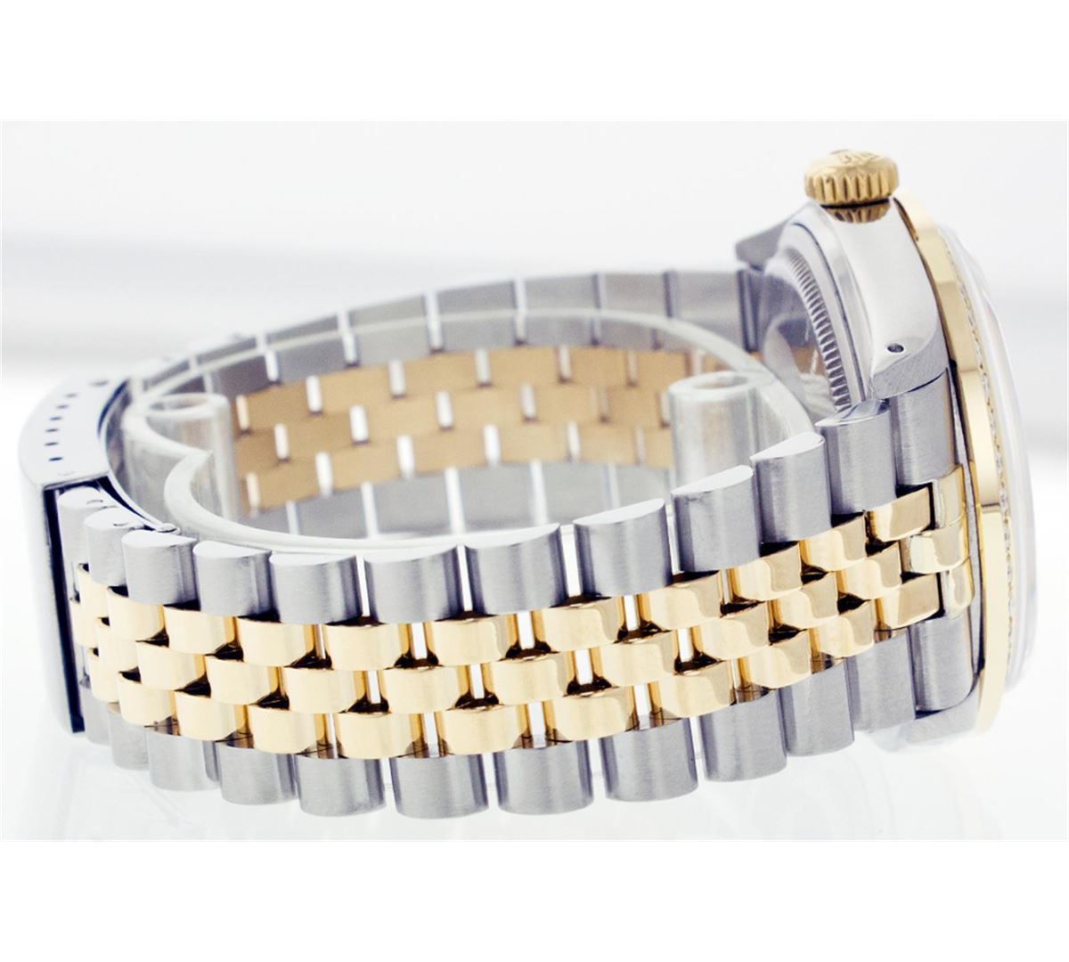 One Mens Two Tone Rolex Datejust Polished, Serviced & Electronically Tested, 14K Yellow Gold & Stainless Steel Case:36mm, 14K Yellow Gold Crown, Custom Bezel: 18K Yellow Gold Beadset Diamond Bezel, Diamond Count: 44 Diamonds Total Weight 1.00 Carat, Clarity: Si-VS, Color: G to H. Custom Crystal: Synthetic Sapphire Cyclops Lens. Movement: Automatic Winding Movement Caliber 3035. Custom Dial: Mother Of Pearl Dial Set With Diamond Hour Markers, 8 Diamonds + 2 Sapphire Baguettes in Dial G To H In Color , Date Window: 3 O'Clock Position Date Display, Quickset, Model: 16013 Condition: G-6 Extra Fine. Bracelet: Two Tone 14K Yellow Gold & Stainless Steel Jubilee. Bright Polish. 6.5 Inch Length, Adjustable. Standard Clasp, With Rolex Logo.