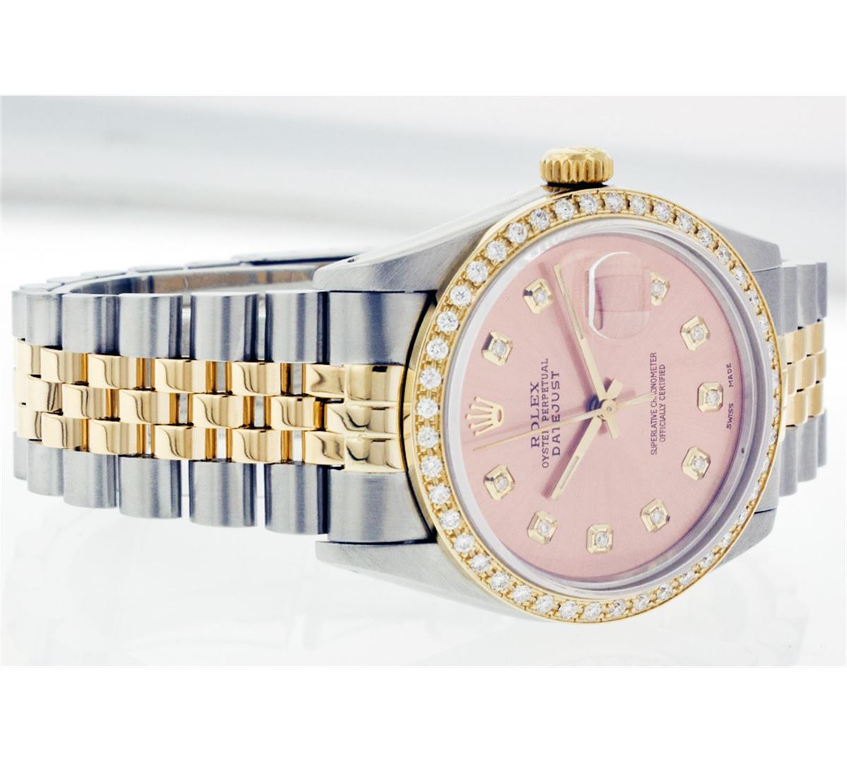One Mens Two Tone Rolex Datejust Polished, Serviced & Electronically Tested, 14K Yellow Gold & Stainless Steel Case:36mm, 14K Yellow Gold Crown, Custom Bezel: 18K Yellow Gold Beadset Diamond Bezel, Diamond Count: 44 Diamonds Total Weight 1.00 Carat, Clarity: Si-VS, Color: G to H. Custom Crystal: Synthetic Sapphire Cyclops Lens. Movement: Automatic Winding Movement Caliber 3035. Custom Dial: Salmon Dial With Diamond Hour Markers. Diamond Count: 10 Diamonds, Color: G to H, Clarity: SI-VS Date Window: 3 O'Clock Position Date Display, Quickset, Model: 16013 Condition: Excellent, G-6 Extra Fine. Bracelet:Two Tone 14K Yellow Gold & Stainless Steel Jubilee. Bright Polish. 6.5 Inch Length, Adjustable. Standard Clasp, With Rolex Logo.