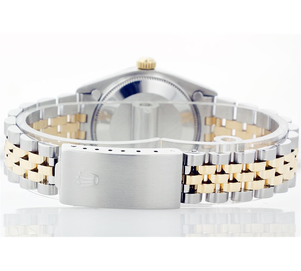 One Gents Two Tone Rolex Datejust Polished, Serviced & Electronically Tested, 14K Yellow Gold & Stainless Steel Case:36mm, 14K Yellow Gold Crown, Custom Bezel: 18K Yellow Gold Bead Set Diamond Bezel, Diamond Count: 44 Diamonds Total Weight 1.0 Carat, Clarity: Si-VS, Color: G to H. Custom Crystal: Synthetic Sapphire Cyclops Lens. Movement: Automatic Winding Movement Caliber 3035. Custom Dial: Mother Of Pearl Diamond + Baguette Dial, Diamond Count: 8 Diamonds + 2 Baguette, Color: G to H, Clarity: SI-VS Date Window: 3 O'Clock Position Date Display, Quickset, Model: 16013 Condition: G-6 Extra Fine. Bracelet: Two Tone 14K Yellow Gold & Stainless Steel Jubilee. Bright Polish. 6.5 Inch Length, Adjustable. Standard Clasp, With Rolex Logo.