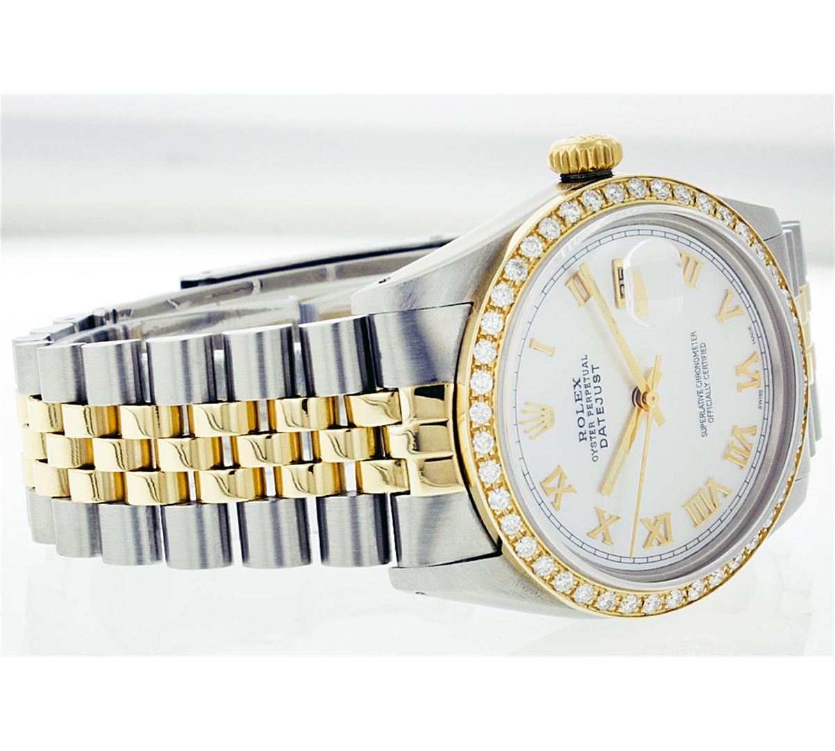 One Mens Two Tone Rolex Datejust Polished, Serviced & Electronically Tested, 14K Yellow Gold & Stainless Steel Case:36mm, 14K Yellow Gold Crown, Custom Bezel: 18K Yellow Gold Beadset Diamond Bezel, Diamond Count: 44 Diamonds Total Weight 1.00 Carat, Clarity: Si-VS, Color: G to H. Custom Crystal: Synthetic Sapphire Cyclops Lens. Movement: Automatic Winding Movement Caliber 3035. Custom Dial: Mother Of Pearl With Roman Hour Markers. Date Window: 3 O'Clock Position Date Display, Quickset, Model: 16013 Condition: G-6 Extra Fine. Bracelet: Two Tone 14K Yellow Gold & Stainless Steel Jubilee. Bright Polish. 6.5 Inch Length, Adjustable. Standard Clasp, With Rolex Logo.