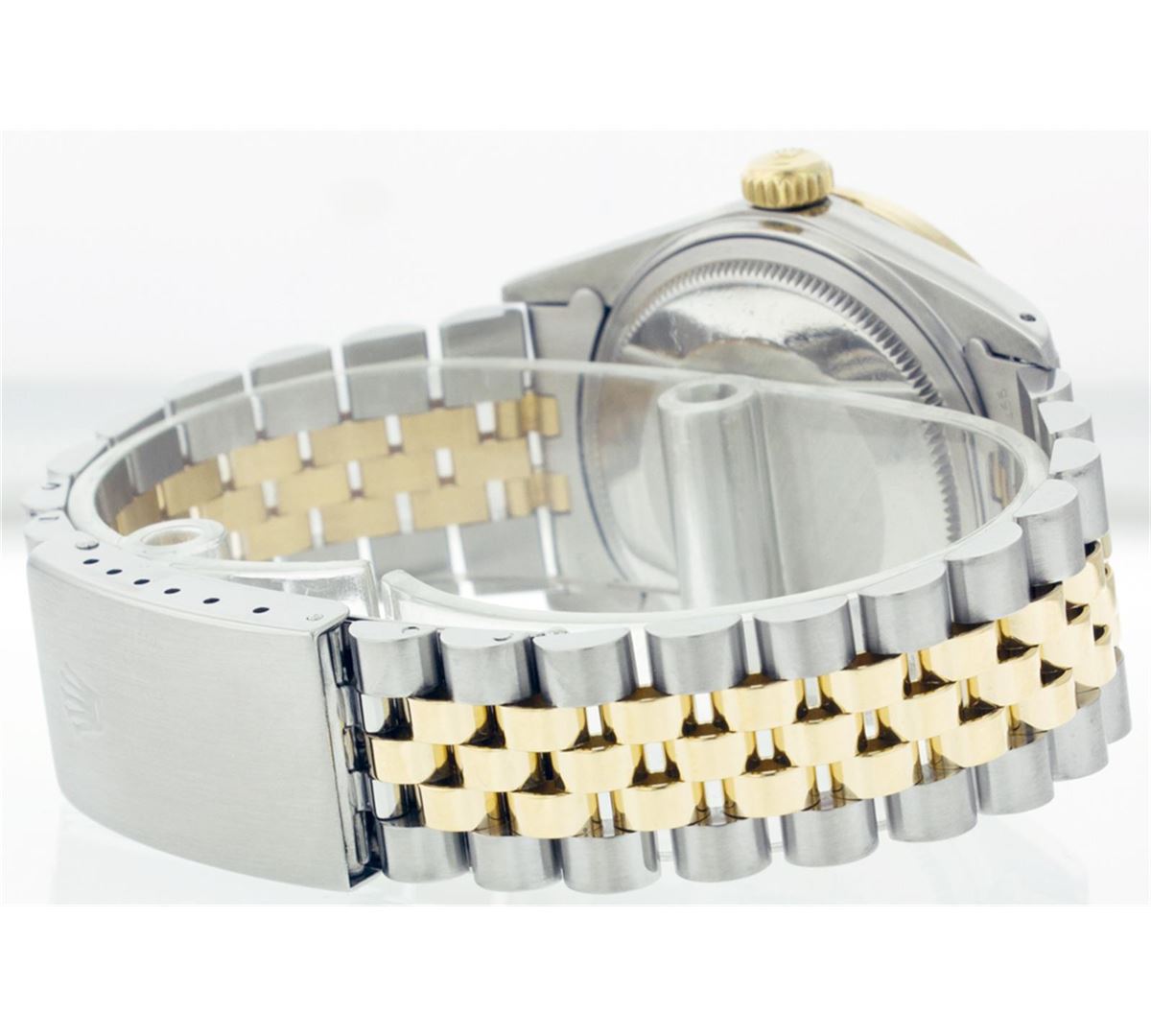 One Mens Two Tone Rolex Datejust Polished, Serviced & Electronically Tested, 14K Yellow Gold & Stainless Steel Case:36mm, 14K Yellow Gold Crown, Custom Bezel: 18K Yellow Gold Beadset Diamond Bezel, Diamond Count: 44 Diamonds Total Weight 1.00 Carat, Clarity: Si-VS, Color: G to H. Custom Crystal: Synthetic Sapphire Cyclops Lens. Movement: Automatic Winding Movement Caliber 3035. Custom Dial: Salmon Dial With Diamond Hour Markers. Diamond Count: 10 Diamonds, Color: G to H, Clarity: SI-VS Date Window: 3 O'Clock Position Date Display, Quickset, Model: 16013 Condition: Excellent, G-6 Extra Fine. Bracelet:Two Tone 14K Yellow Gold & Stainless Steel Jubilee. Bright Polish. 6.5 Inch Length, Adjustable. Standard Clasp, With Rolex Logo.